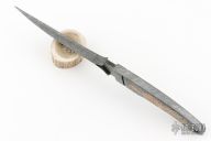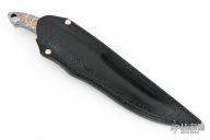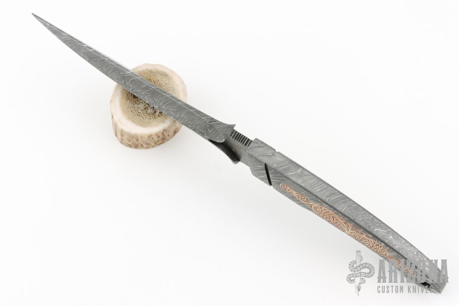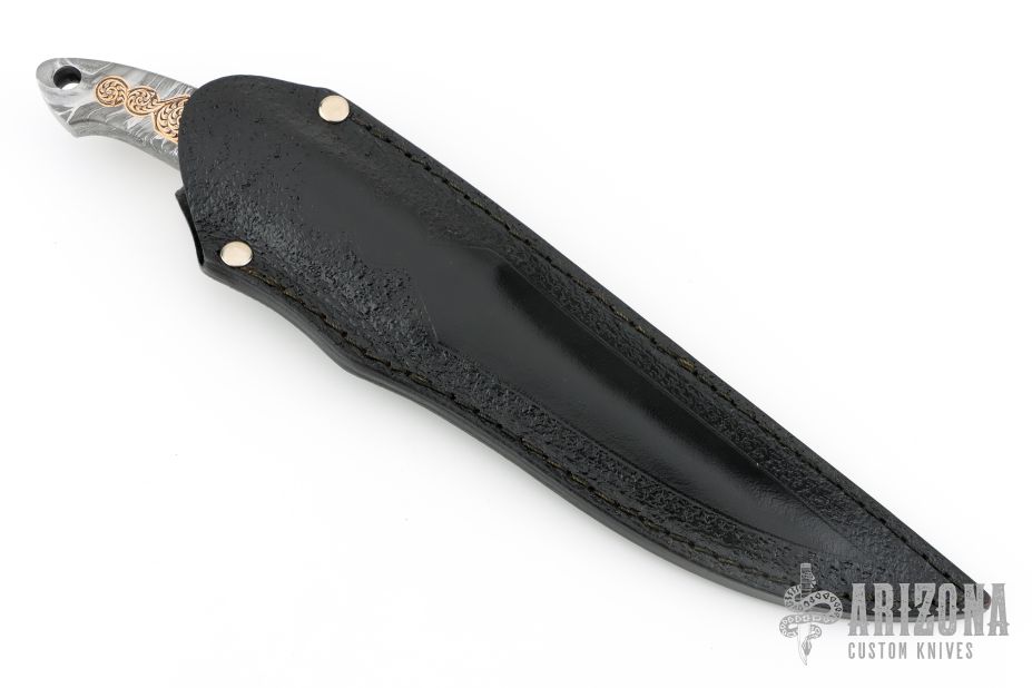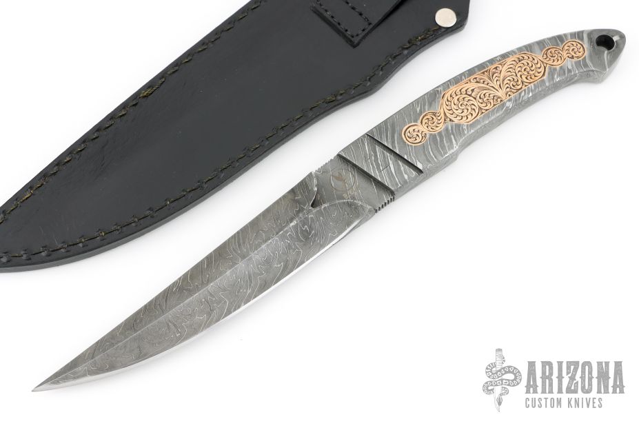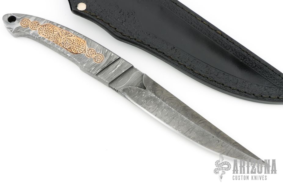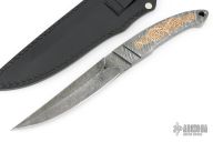 This Integral Toothpick Knife by Black Ore Knives features a Flame Distortion Mosaic Damascus blade with false top edge and notched thumbrest, .492" blade stock and 1.146" blade depth, full integral construction. The handle has engraved copper inlays and a lanyard hole. Comes with a hand tooled black leather sheath and COA. New from maker.