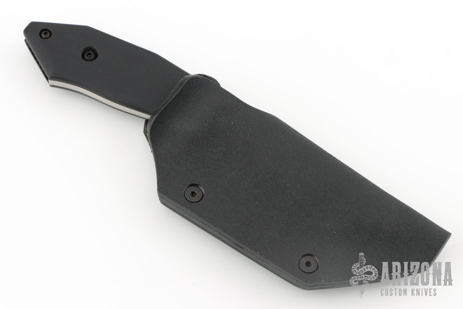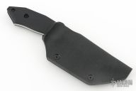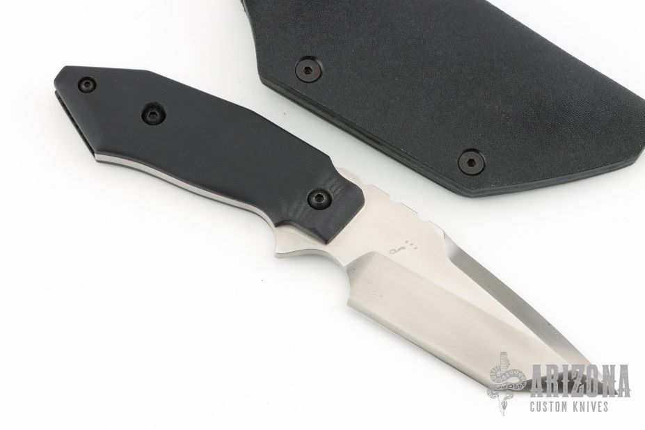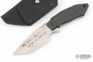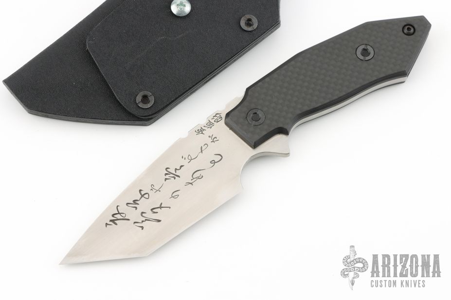 This custom fixed blade by Kazutoshi Tanabe features a hand rub satin finished chisel ground blade with a false top edge and notched thumbrest, .156" blade stock and 1.471" blade depth, full tang construction. The handle has carbon fiber scales. Comes with kydex sheath. Excellent condition.