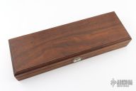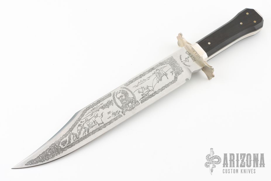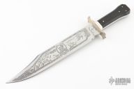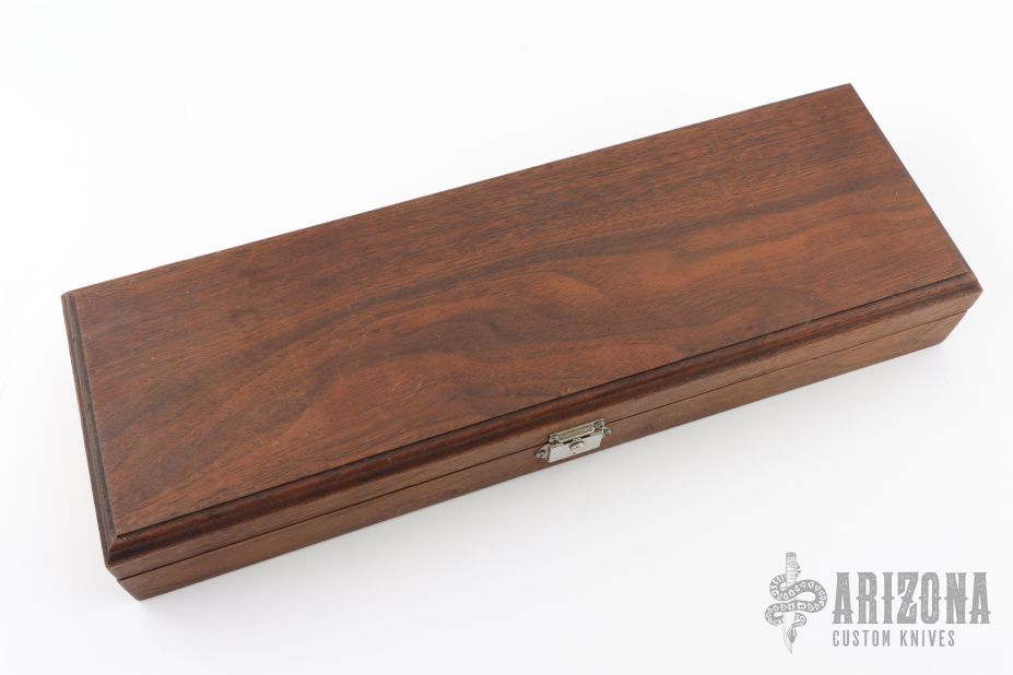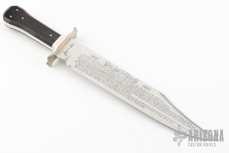 The Capt. "Jack" Hays Bowie by Jack Crain is a limited edition of 20 and this one is #3. It has a hand rub satin finished blade with false top edge, .252" blade stock and 1.806" blade depth, hidden tang construction. The handle has a silver guard and frame, dark wood scales with nickel silver pins. Comes with original wooden presentation box. The knife is in excellent condition.