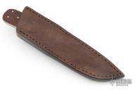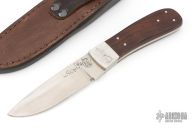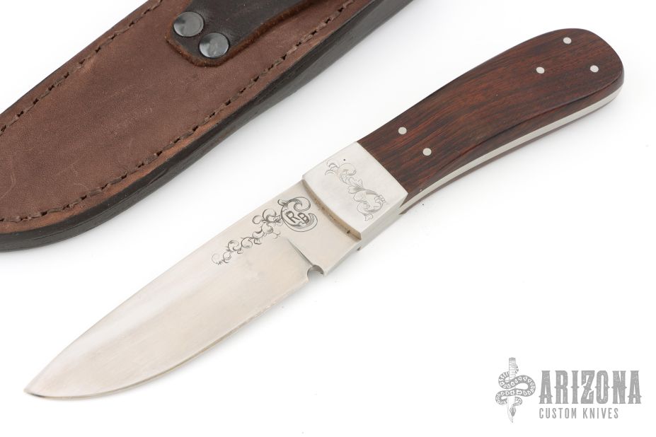 This knife by Ray Beers features a hand-rubbed satin finish blade with .146" blade stock, 1.132" blade depth, and full tang construction. The handle has dovetailed stainless steel bolsters, and a pinned, contoured wood handle. Engraving work on one side of blade and both bolsters. Comes with a leather belt sheath. Has some scratches, excellent condition otherwise.