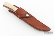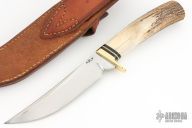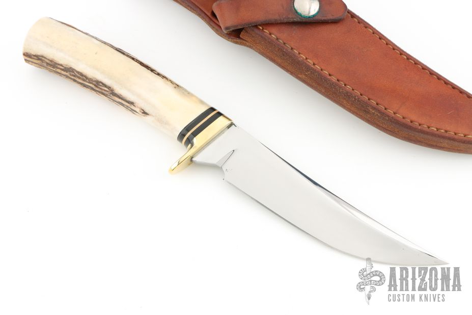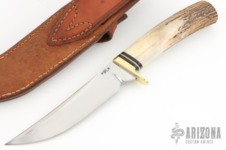 This knife by LB Lienemann has a mirror finished trailing point blade with .25" blade stock and 1.201" blade depth, hidden tang construction. The handle has a brass guard, stag grip with black spacers. Comes with a brown leather sheath. Has some light scratches, otherwise excellent condition.