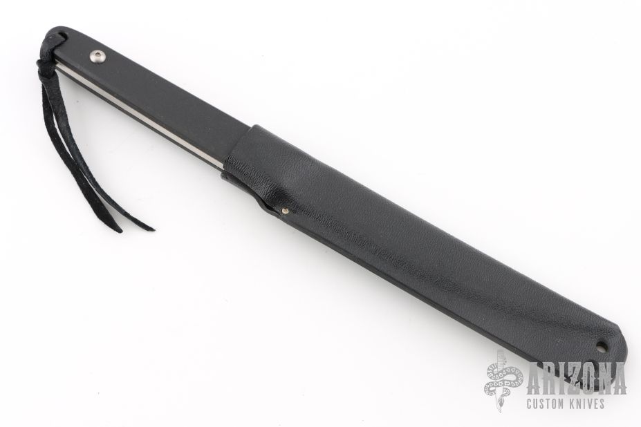 This knife features a satin finished blade, .131" blade stock and .683" blade depth, full tang construction. The handle has black (Kydex?) scales with lanyard hole. Comes with kydex neck sheath. Has some light scratches, otherwise excellent condition.