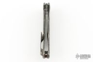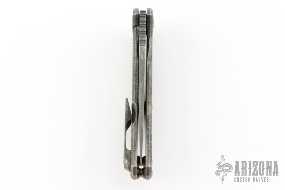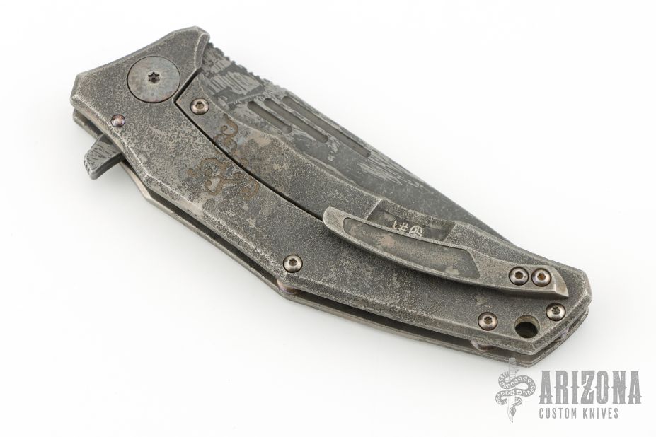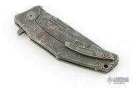 This Morrf-4 by Custom Knife Factory was customized by SB Knives and is marked #1. It features an upswept custom acid etch finished blade with notched thumbrest and flipper. The handle has a distressed looking laser engraved titanium frame with matching tip up clip, lanyard hole and polished barrel spacers. Nice detent, lockup and blade seating, #1. Comes with nylon zippered case and COA dated 02/16. Excellent condition.