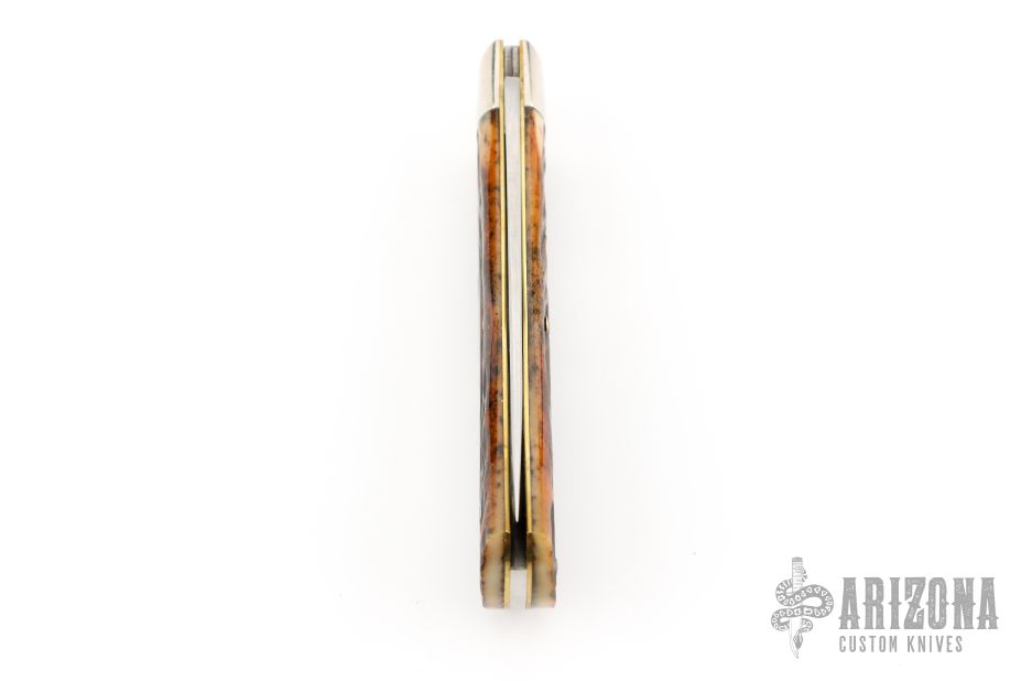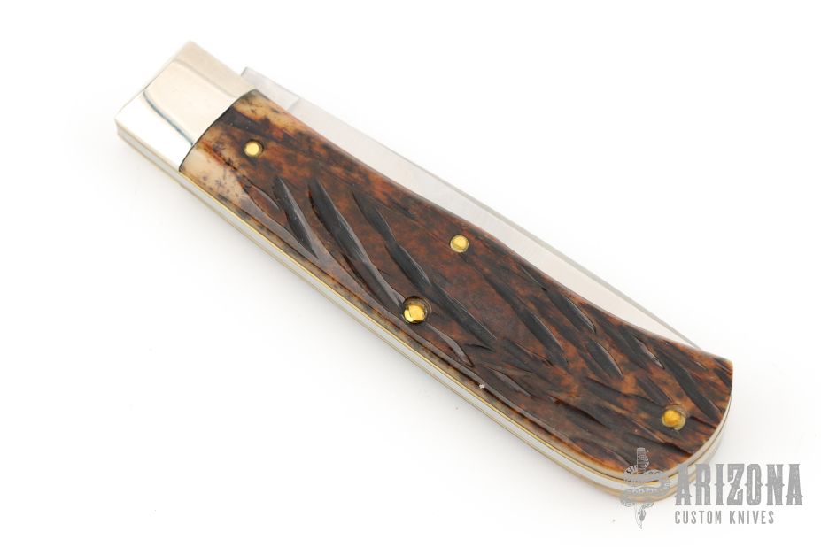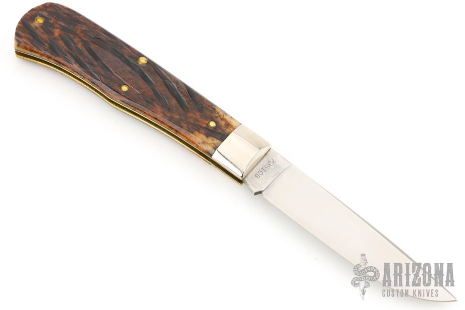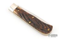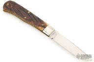 This knife by Great Eastern Cutlery features a satin finished blade with nail nick. The handle has nickel silver bolsters that are pinched, brass liners, horsecut antique bone covers. Has half-stop. Comes with original tube. Excellent condition.