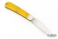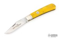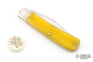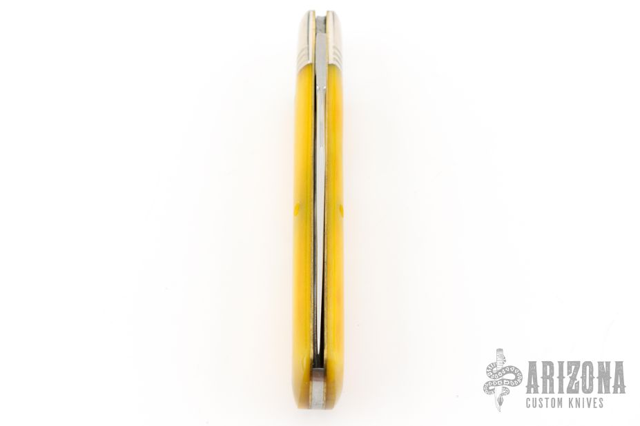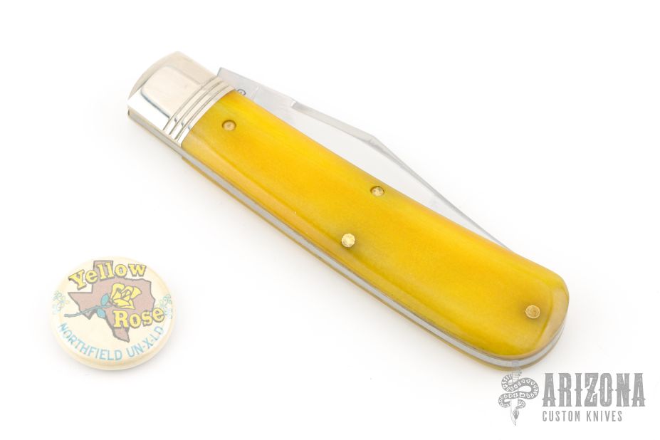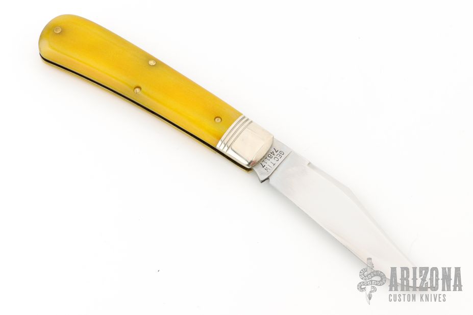 This Stallion by Northfield Knives features a polished blade with nail nick. The handle has nickel silver fluted bolsters, yellow bone covers with brass liners/pins, steel spring. Has half-stop.  Comes with original tube. Excellent condition. 273 Made.