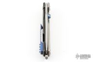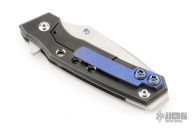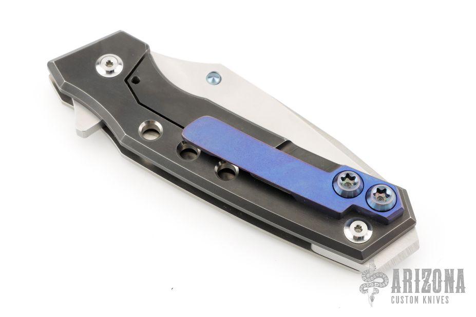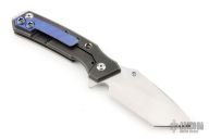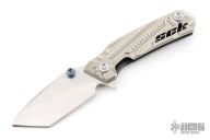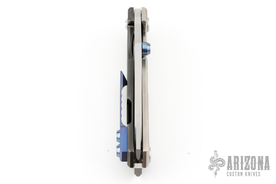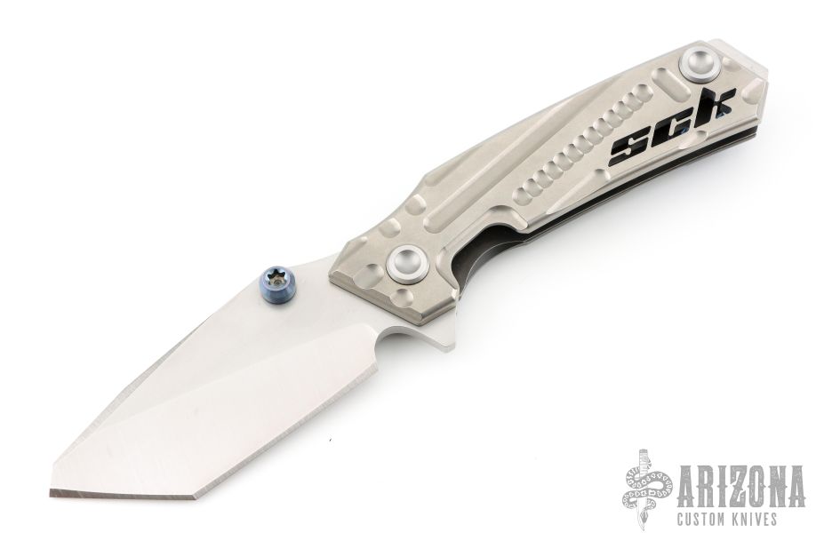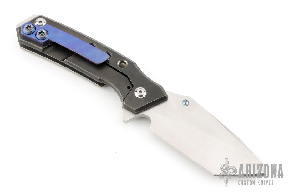 This Rogue Shark by Skike Knives features a satin finished blade with single thumbstud and flipper tab. The handle has a matte finished titanium handle with anodized titanium tip up clip, stainless steel floating backspacer. Nice detent, lockup and blade seating, rides on bearings. Has a couple light scuffs, excellent condition otherwise.
