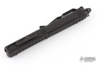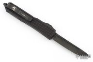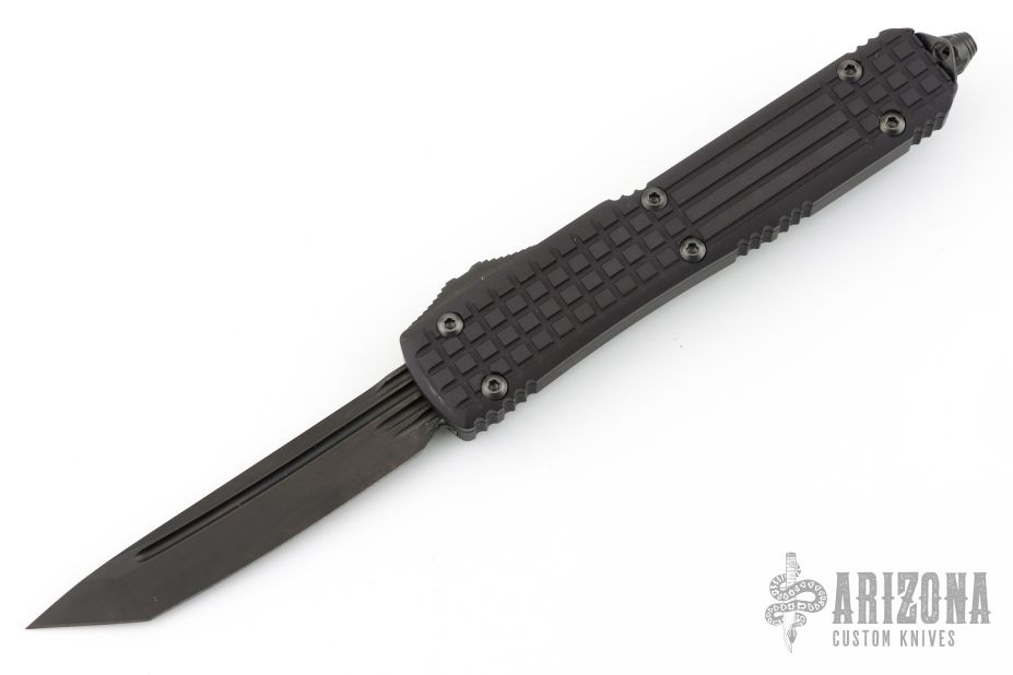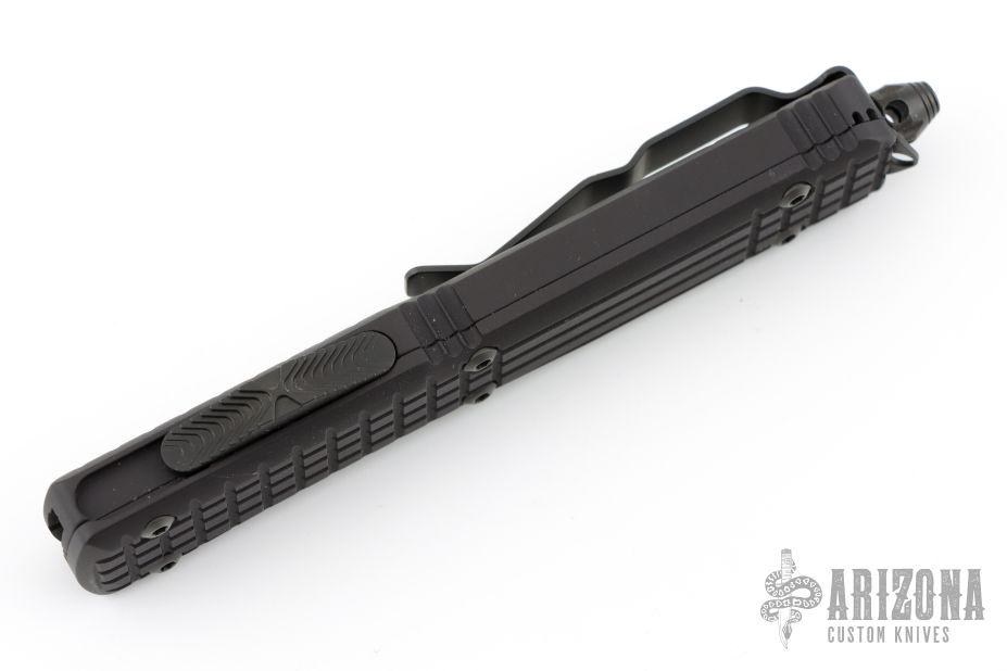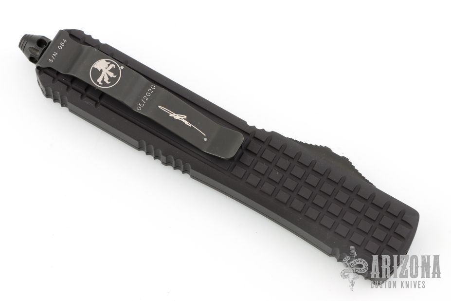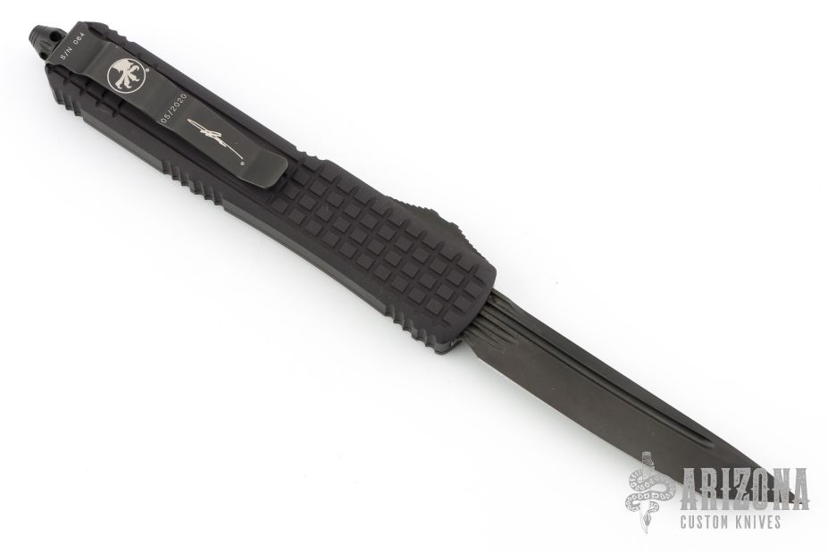 The Ultratech is a precision-made, out-the-front tactical knife. Has a fluted DLC standard tanto blade. Black frag pattern aluminum handle with black hardware, tip down stainless steel clip and nickel boron internals. Comes with original box. Has a couple light scuffs, excellent condition otherwise. S/N 064 Dated 05/2020