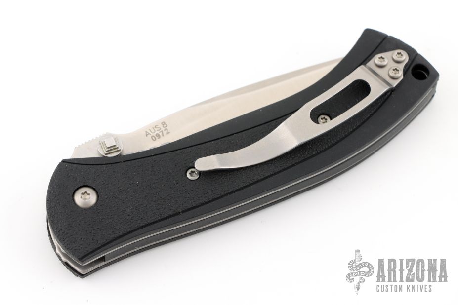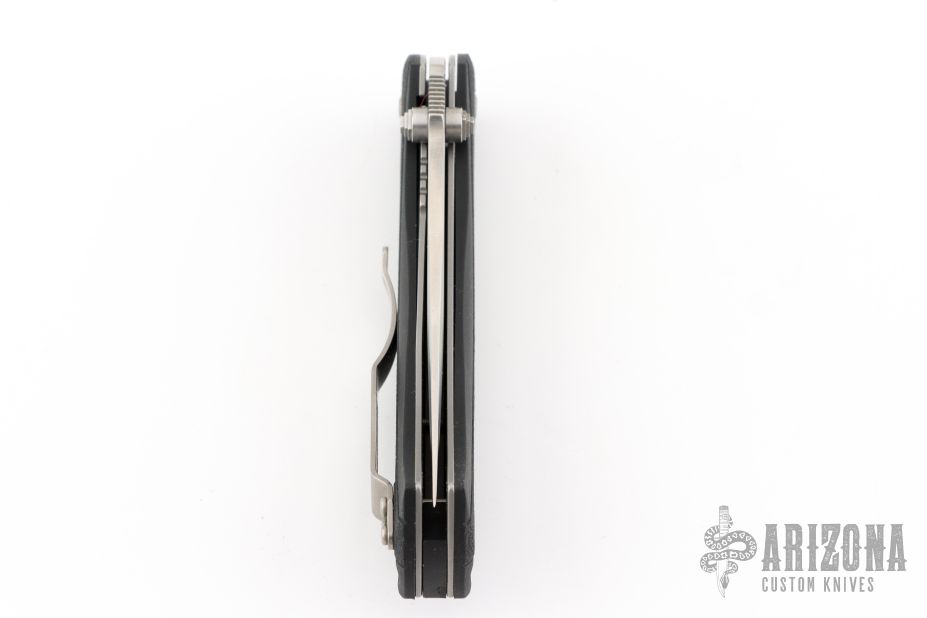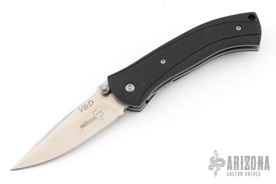 This Scale Release Automatic from V&D Knives (Butch Vallotton and Matt Diskin) features a satin finished spear point blade with swedge, dual thumb studs and notched thumb rest. The handle has black polymer scales over steel liners and black polymer backspacer. Lanyard hole in pommel. Stainless steel tip up clip and lanyard hole in pommel. Excellent condition.