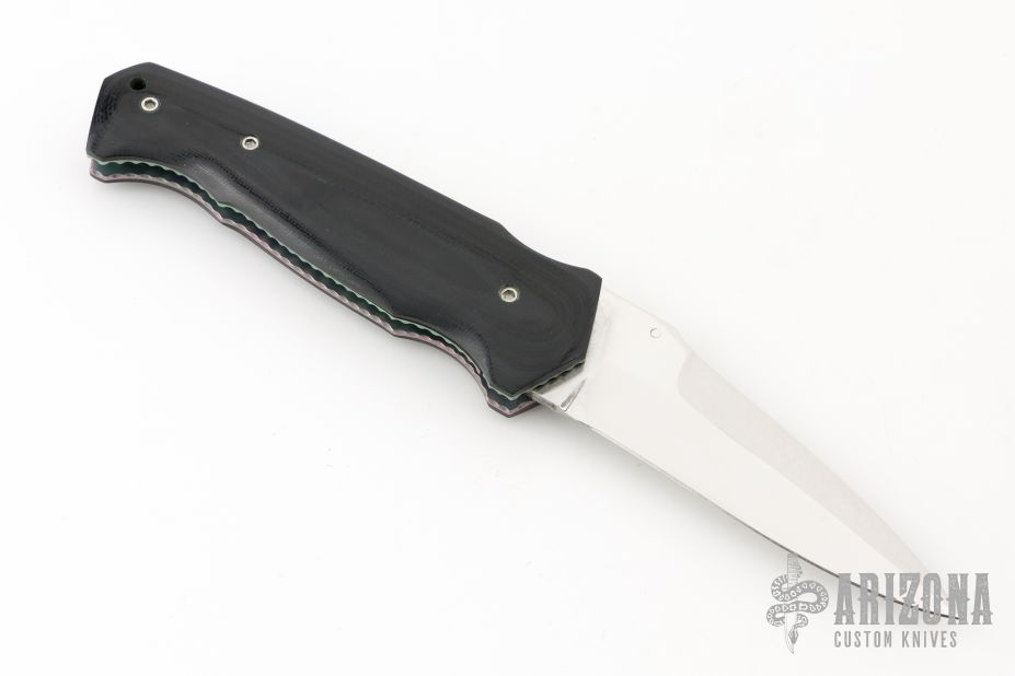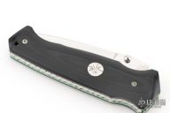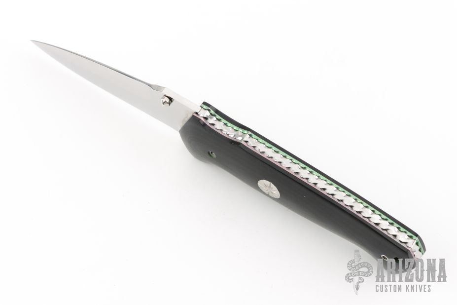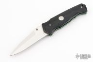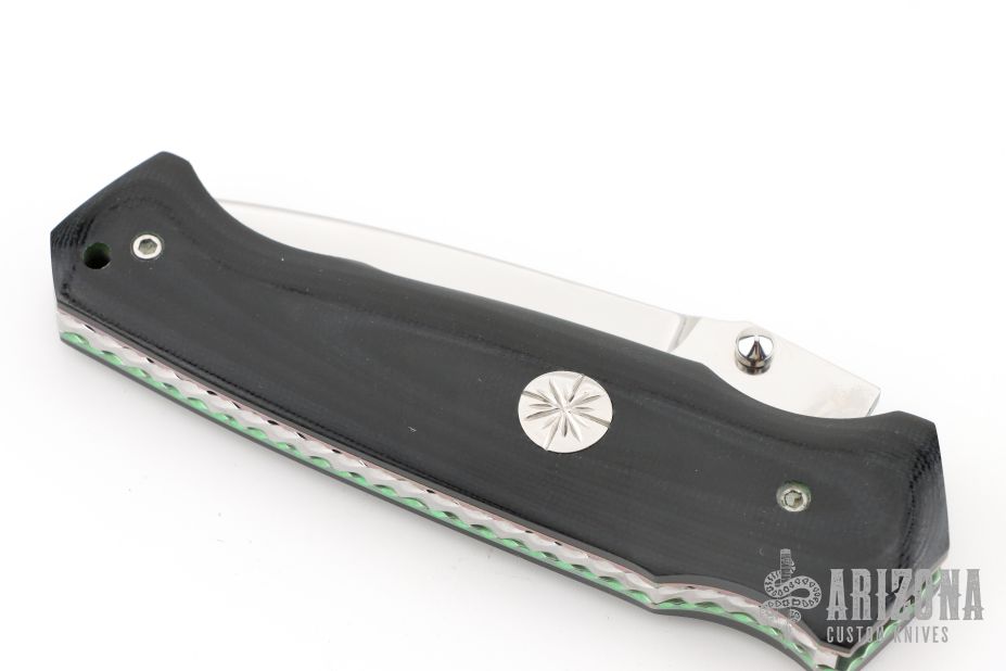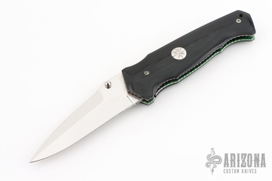 This D/A Auto by Shawn Vallotton features a mirror polished drop point blade with a single dual thumbstud. The handle has black G-10 scales, file-worked titanium liners and a file-worked stainless steel backspacer. Nice action, lockup and blade seating. Excellent Condition.