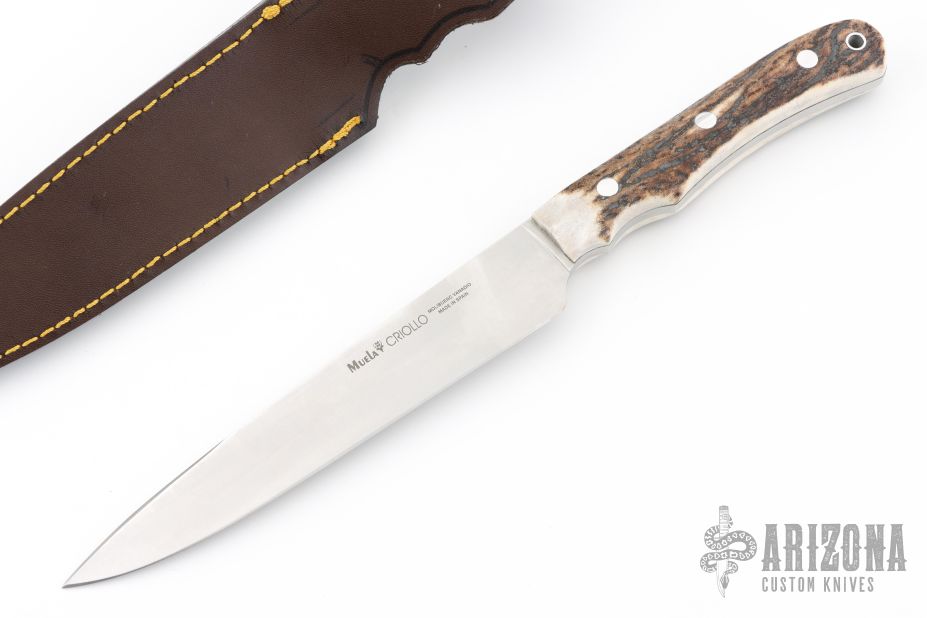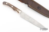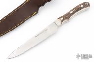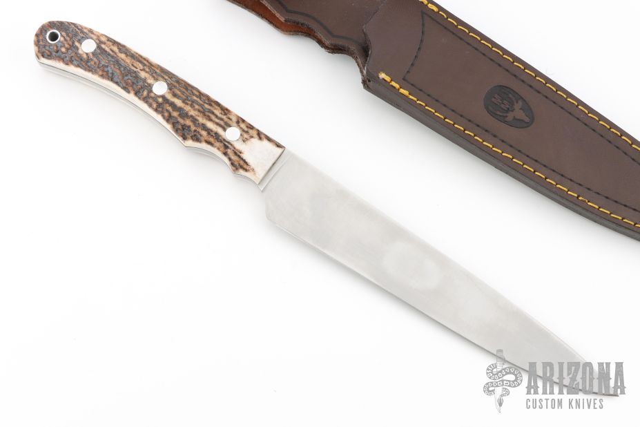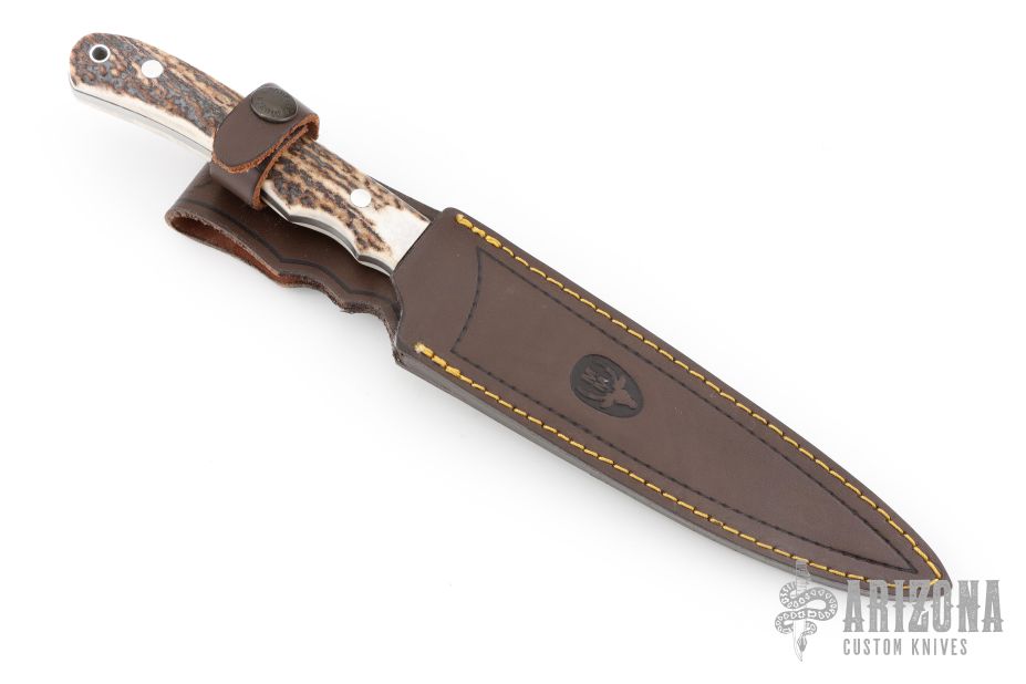 This fixed blade features stag scales and aluminum pins and lanyard hole. The blade is high polished. Full tang construction. .157" blade thickness and 1.196" blade depth. Comes with a brown leather sheath. Has a few light scratches, good condition.