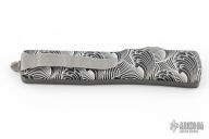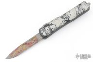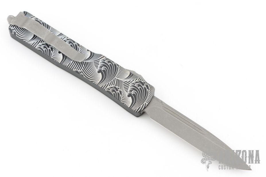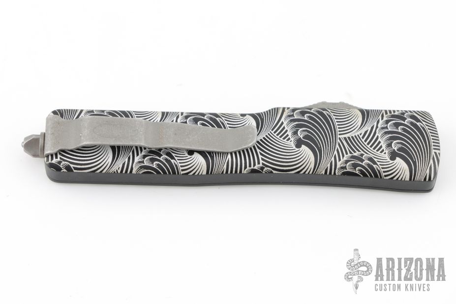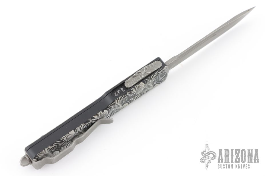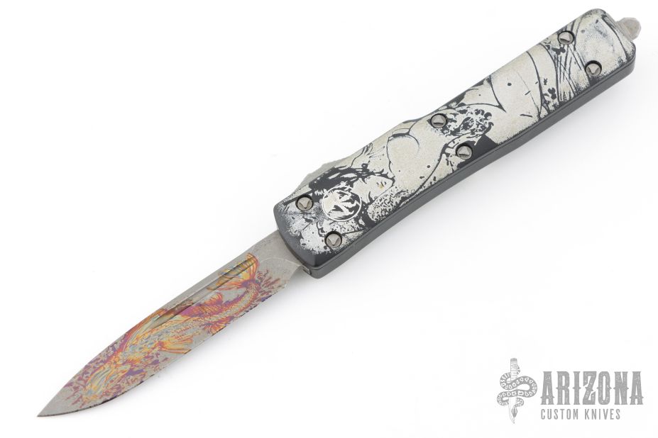 This UTX-70 OTF automatic by Microtech features an apocalyptic finished blade with a standard single edge. The handle has a black aluminum frame with blasted stainless steel tip down clip. Serial number 12443 and dated 06/2020. Has a few light scuffs, otherwise excellent condition. Laser engraved and art by PVK Vegas.