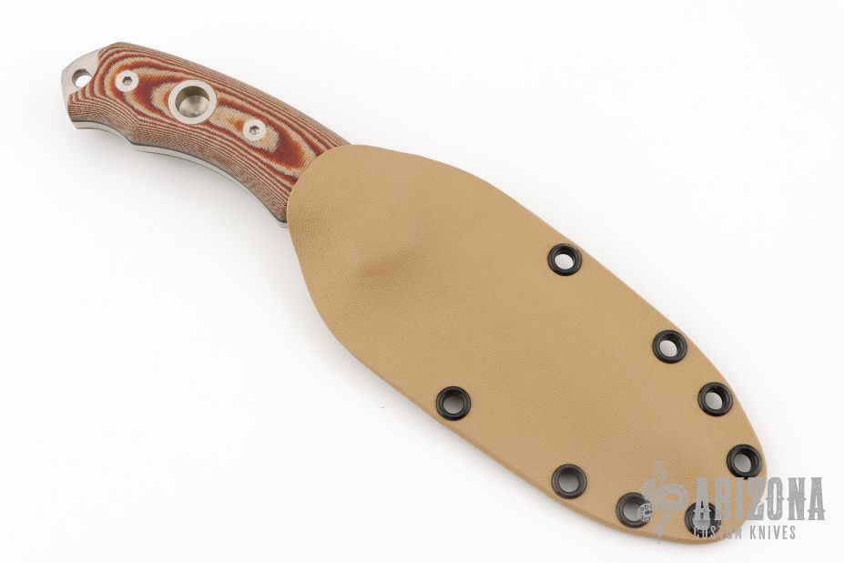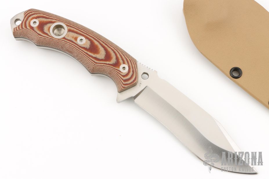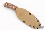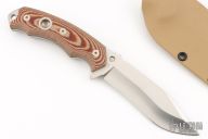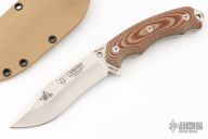 This knife by Cudeman features a satin finished N-695 clip point/recurve blade with full tang construction, .193" blade stock and 1.29" blade depth.  The handle features micarta covers with black liners, and lanyard hole in exposed pommel. Comes with a Kydex sheath. Has a few light scratches, otherwise excellent condition.