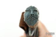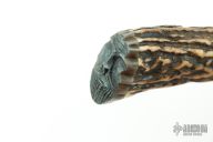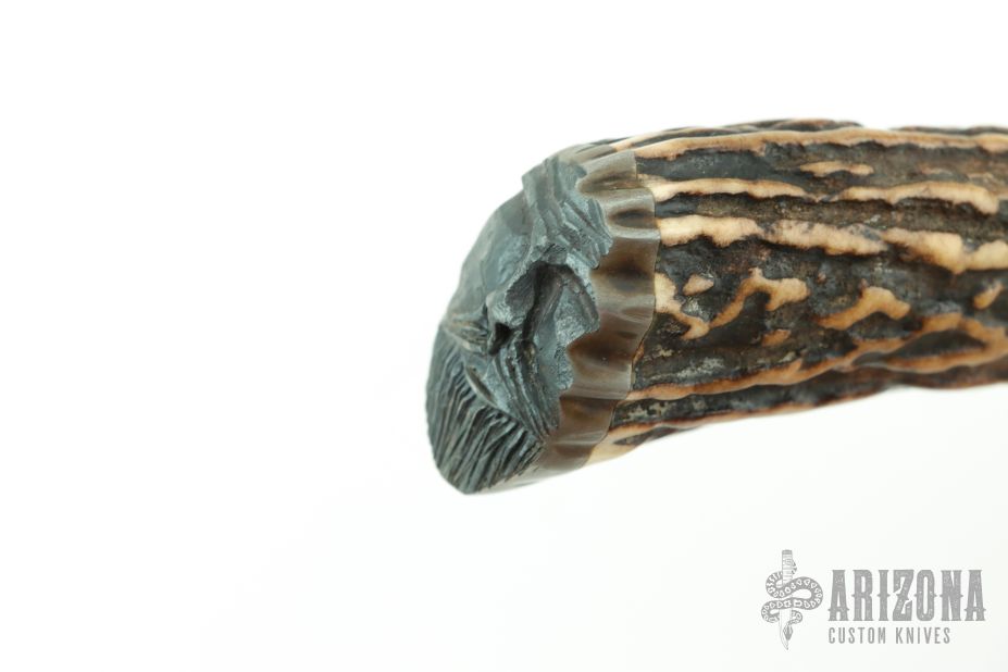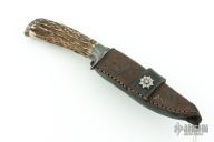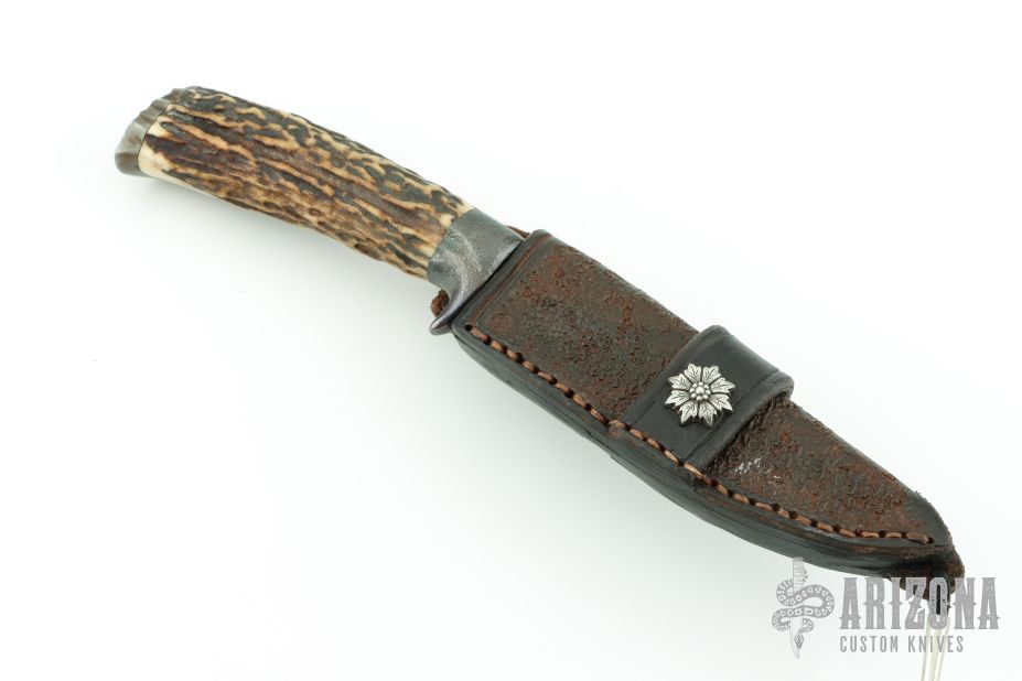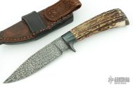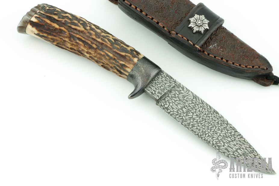 This knife by David Lisch was made in 2007-2008 before he was a Journeyman Smith. The blade is mosaic Damascus with a full flat grind, .228" blade stock and 1.145" blade depth, hidden tang construction. The handle has a forged wrought iron guard, stag grip with a carved face in the wrought iron butt. Comes with a hand tooled brown leather sheath with a silver flower concho. Excellent condition.