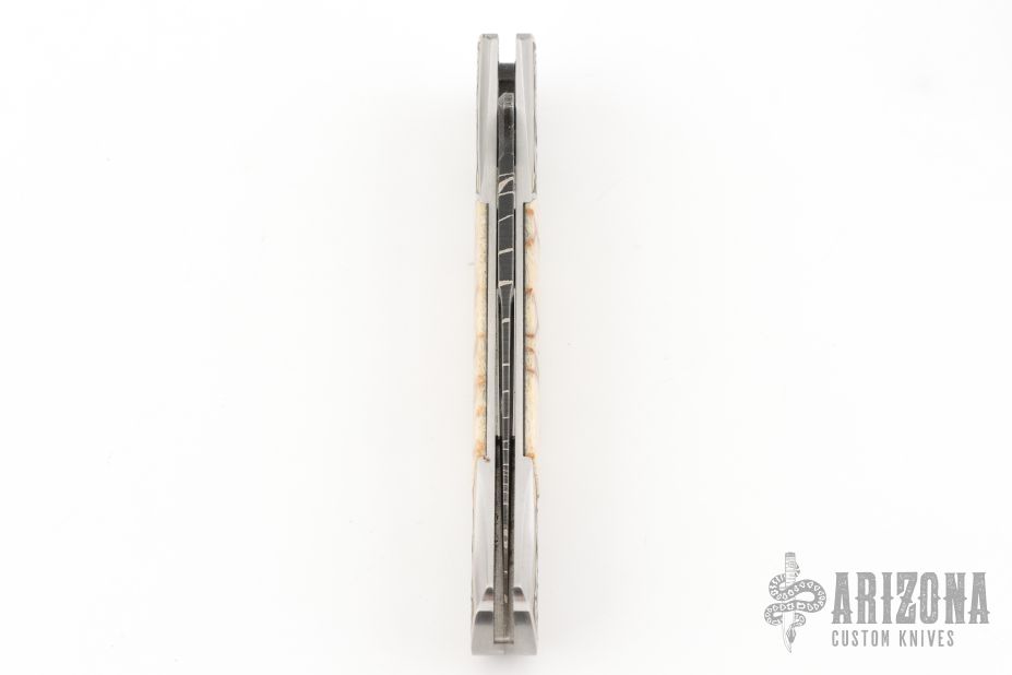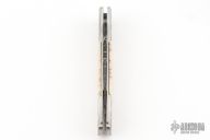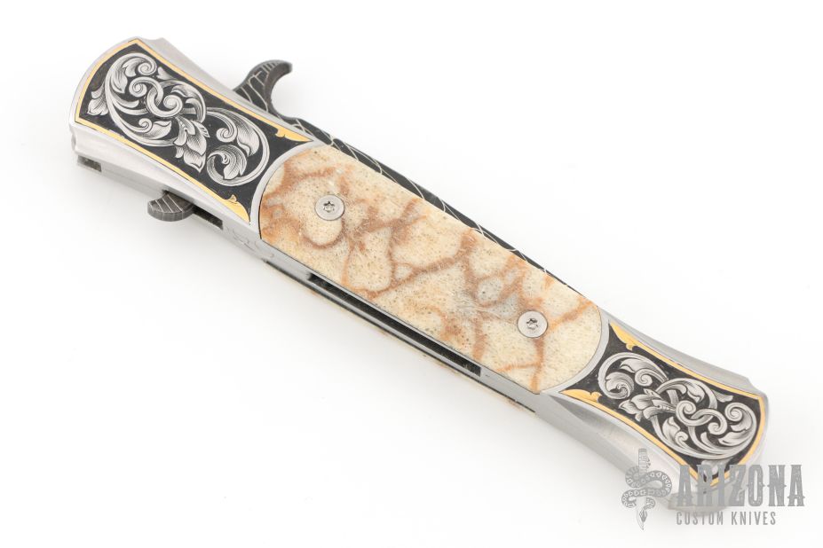 This Don Ultimate Custom by Protech was engraved by Bruce Christensen. It features an Eggerling mosaic Damascus blade. The handle has a 416 stainless steel frame with tiger coral inlays and a mosaic pin push button. The engraving has 24k gold inlays. Comes with original box and papers. Excellent condition.