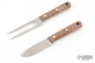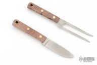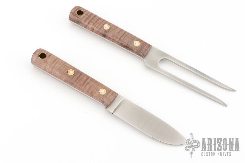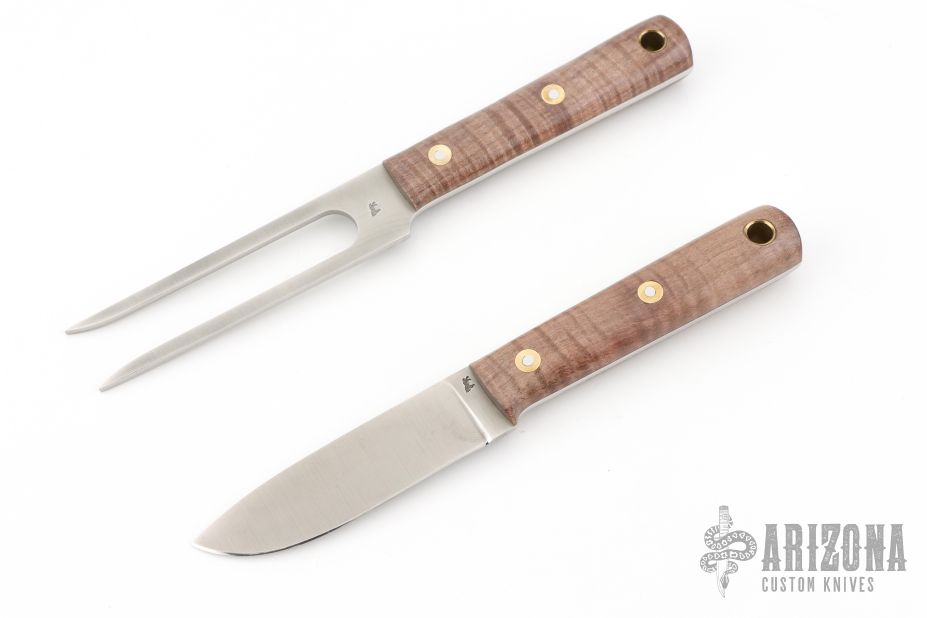 The Camp Cook Set by Blind Horse Knives features a satin finished blade with .123" blade stock and 1.010" blade depth, full tang construction. The handle has curly maple scales, lanyard hole pommel. Comes with a matching fork. Excellent condition.