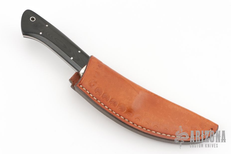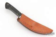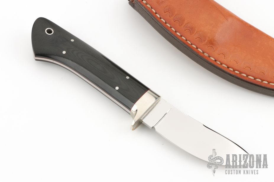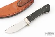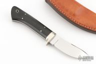 This Semi-Skinner by Jerry Langbein features a mirror finished blade with a notched thumbrest, .150" blade stock and 1.019" blade depth, full tapered tang construction. The handle has a nickel silver guard, black linen micarta scales with red liners. Comes with a hand tooled brown leather sheath stamped '03. Excellent condition.