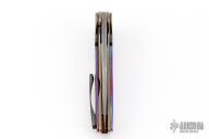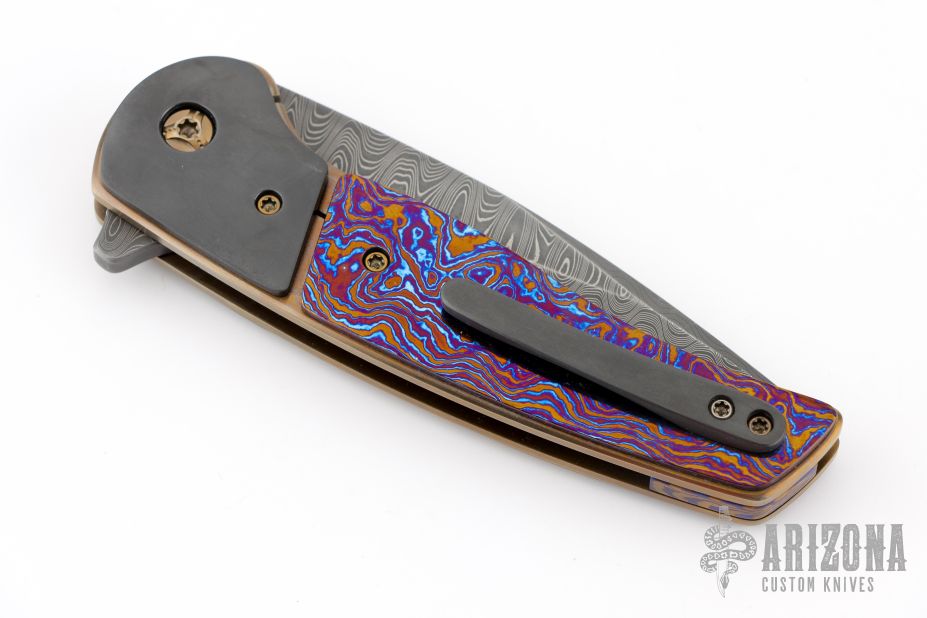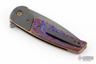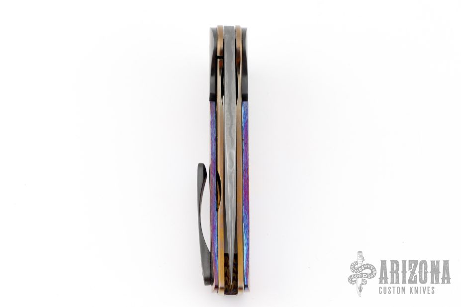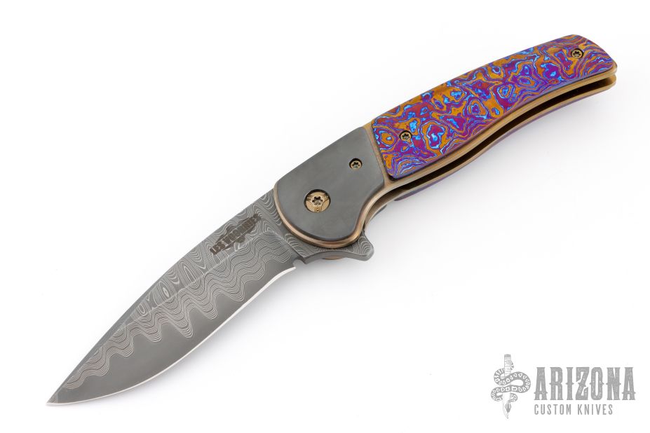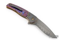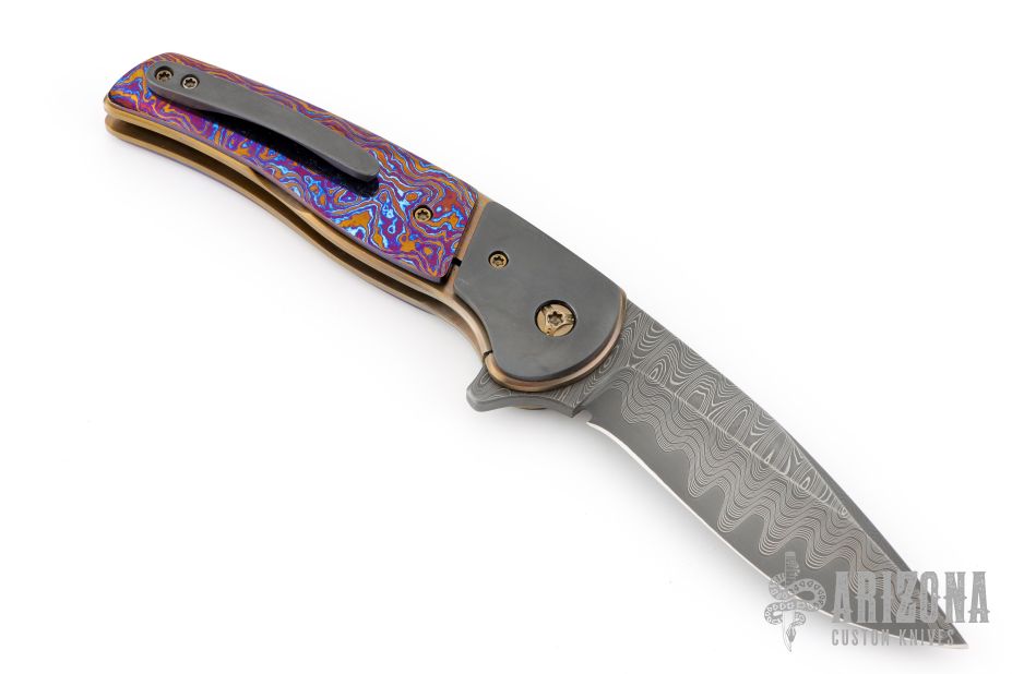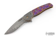 This Model 15 liner lock flipper features a Damascus tanto blade with flipper. The handle has zirconium bolsters, MokuTi scales, anodized titanium liners, and tip up zirconium clip.  Mokuti backspacer. Includes a caged bearing system for smooth and fast flipper opening that requires no wrist action. Nice blade seating, detent and lockup. Very nice work. Excellent Condition.