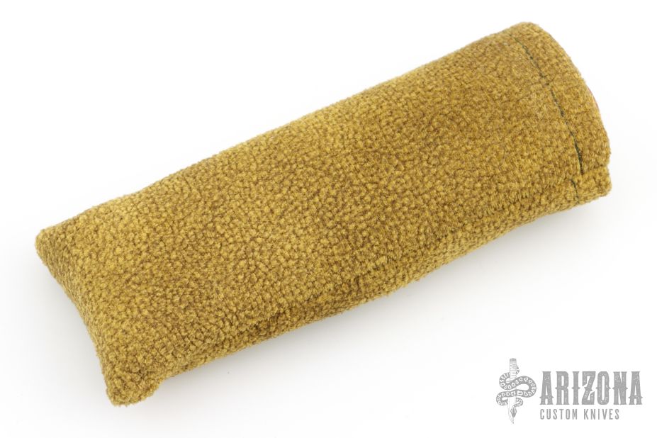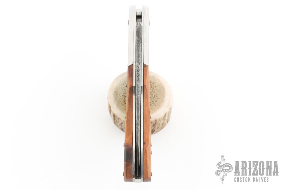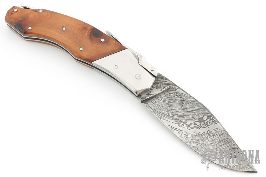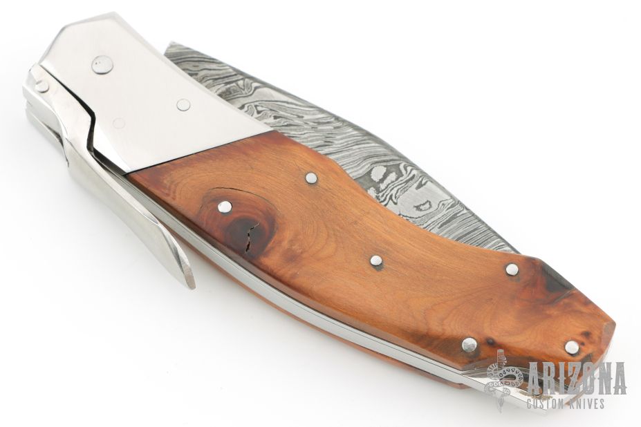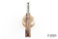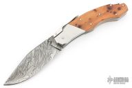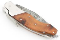 This Ristigouche 1760 by Thierry Le Senecal features an Explosion pattern Damascus blade with false top edge. The handle has stainless steel dovetailed bolsters, 1000 year old Yew wood scales from the Ecouves Forest, old fashioned quilted rivets, stainless steel liners and backspacer with lanyard hole. Has a "Palanquille" locking system dating back to 16th-17th century, France. Has nice blade seating. Has a tiny about of vertical blade play and small gaps between the bolsters, scales and liners, otherwise excellent condition.