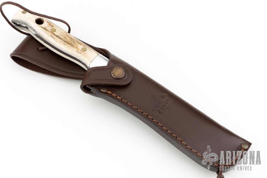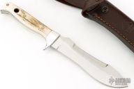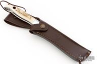 This Custom White Hunter by Richard Johnson features a mirror polished blade with a sharpened back edge for hacking, and a notched thumbrest, .188" blade stock and 1.413" blade depth, full tang construction. The handle has an aluminum guard with stag scales, lanyard hole at the butt. Comes with a Puma brown leather sheath. Has a few light scratches and spots on the blade, otherwise excellent condition.