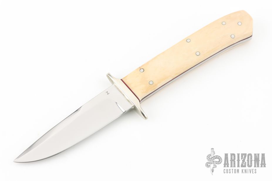 This Chute knife by Z Custom Knives features a mirror polished clip point blade with a sharpened top edge, .122" blade stock and .799" blade depth, full tang construction. The handle has a nickel silver guard with mammoth ivory scales with red liners. The scales have a couple of small cracks around the pins, otherwise good condition.