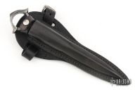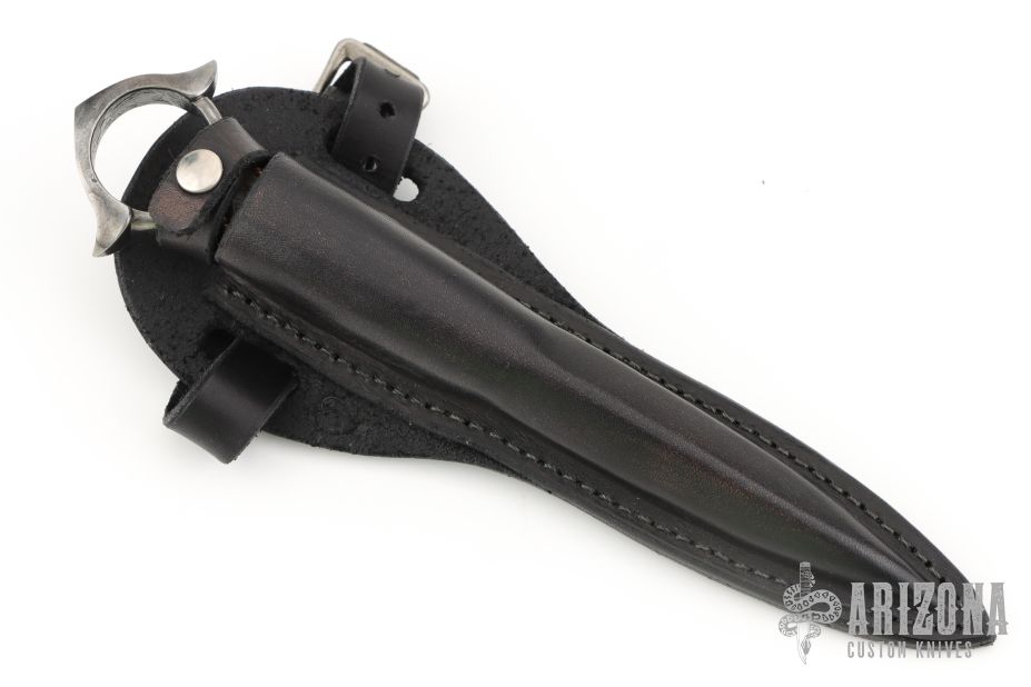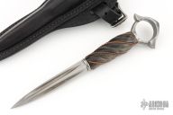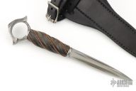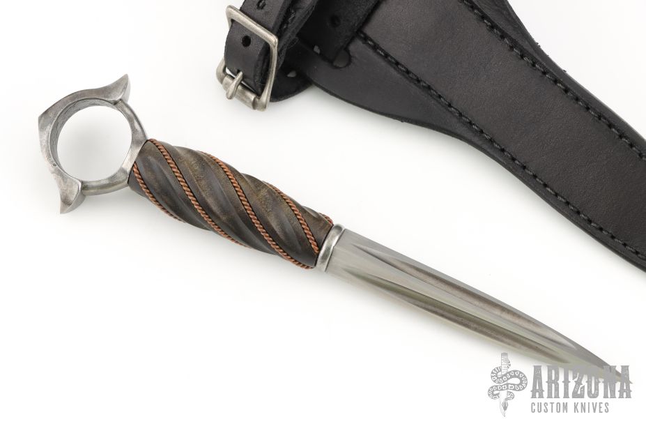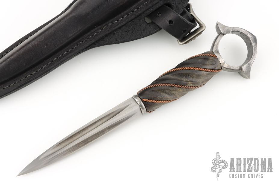 This dagger by Paul Cooper has a square fluted dagger blade that is satin finished, .450" thick at the guard, hidden tang construction. The handle has forged steel guard and ring at the butt with a spiral fluted wod grip with twisted copper wire inlays. Comes with a black leather sheath. Excellent condition.