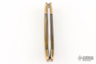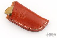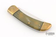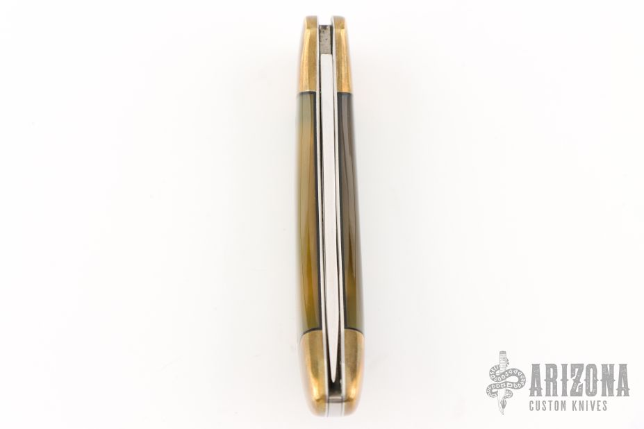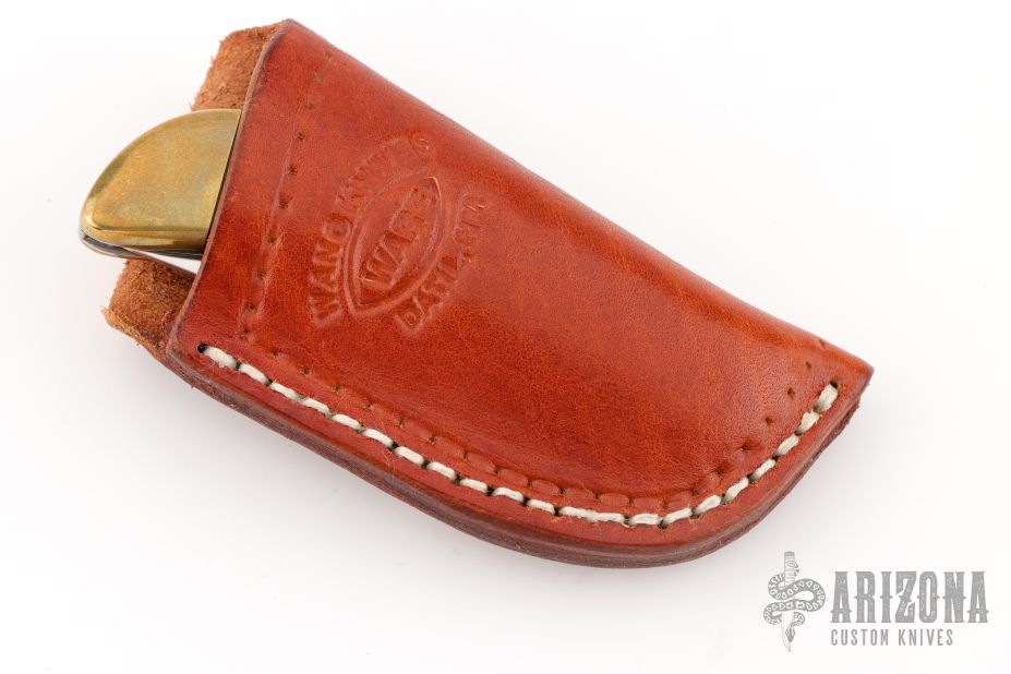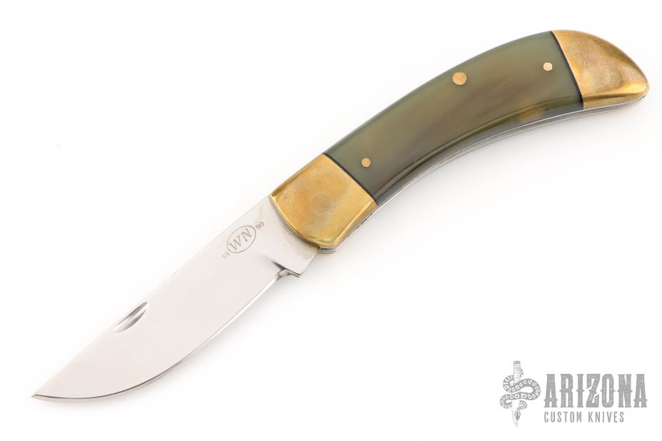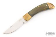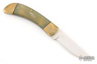 This slipjoint by Tommy Ware features a satin finished blade with a nail nick. The handle has brass bolsters, stainless steel liners, onley horn covers with black liners, stainless steel backspacer. Comes with a brown leather sheath and a Velcro case. Dated 1990. Has a couple light scratches, otherwise excellent condition.