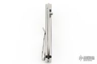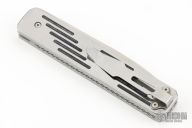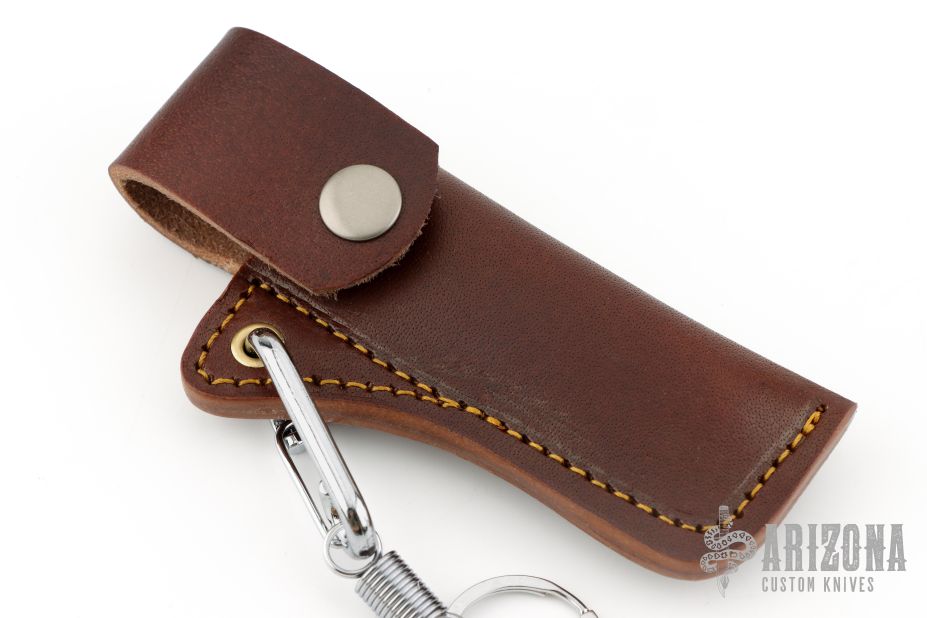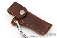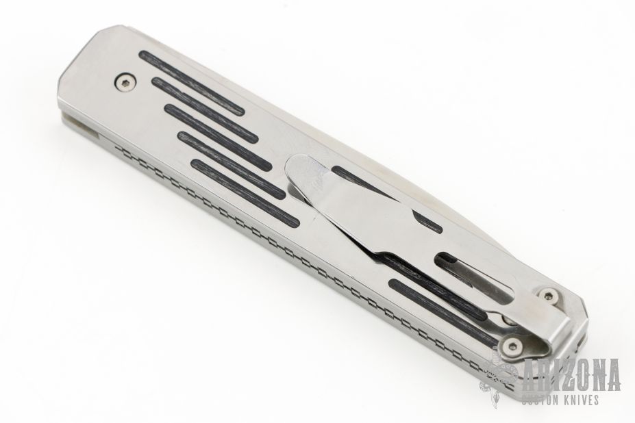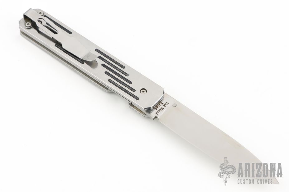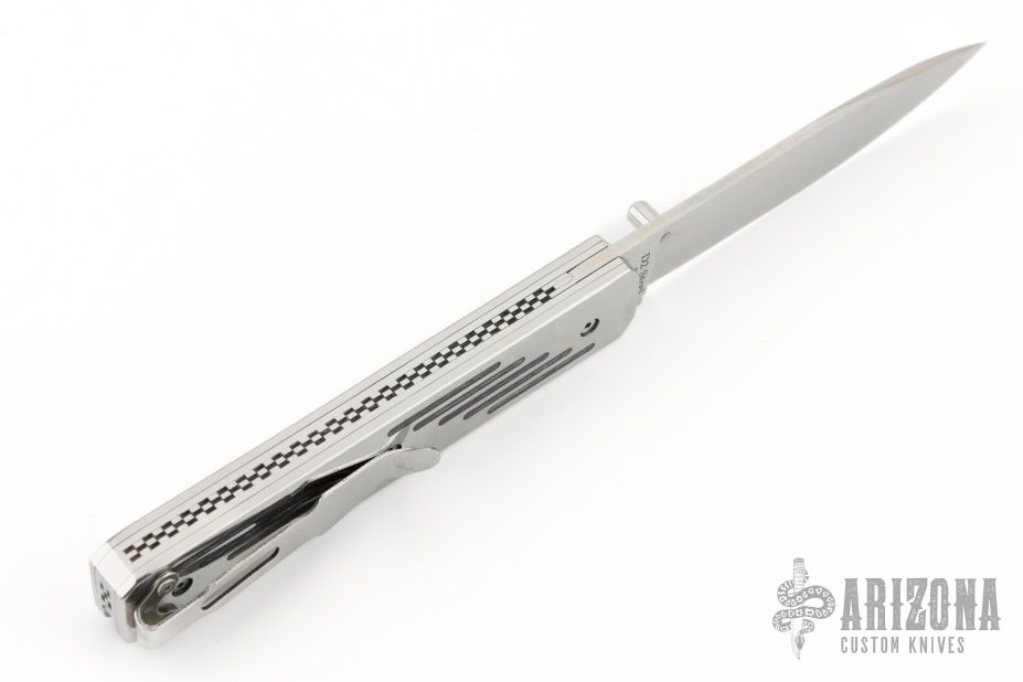 This linerlock by EMA Forge features a high satin finished blade with single thumbstud. The handle has stainless steel scales with black wood inlays, stainless steel liners and checkered backspacer, stainless steel tip up clip. Nice lockup. Comes with a brown leather sheath and original box. New from maker.