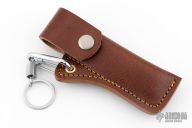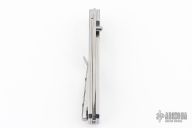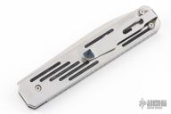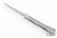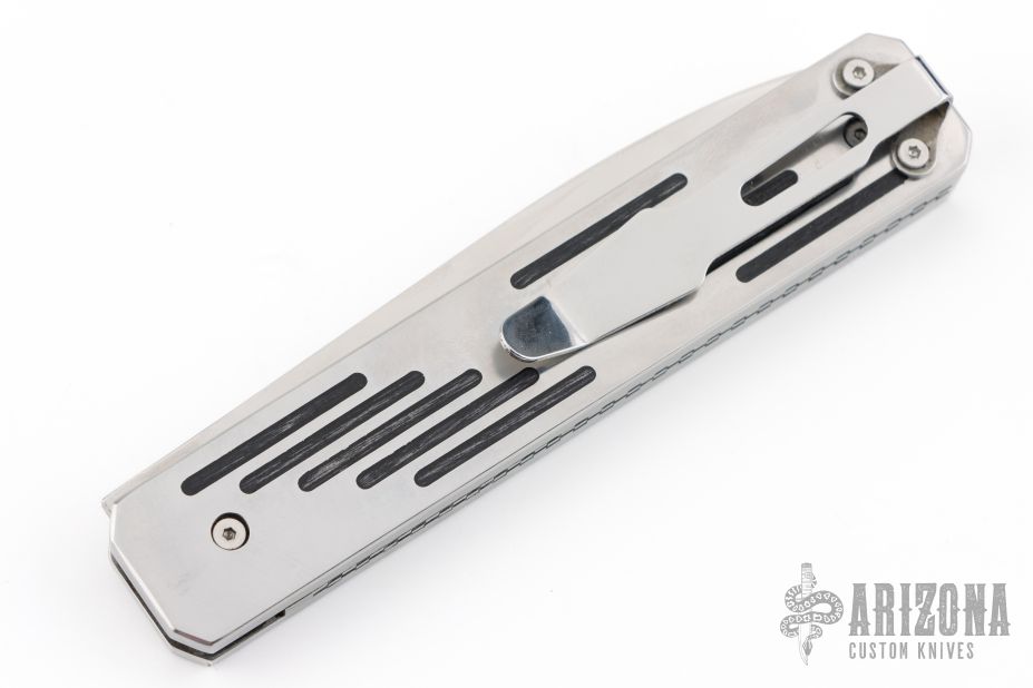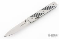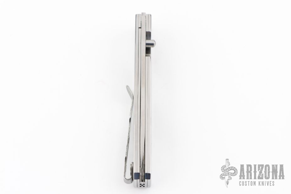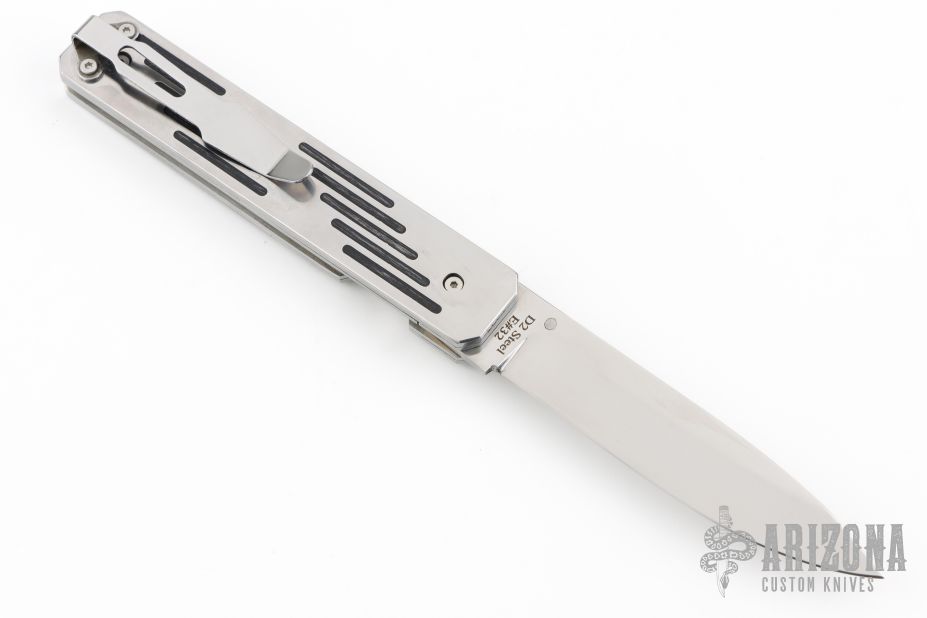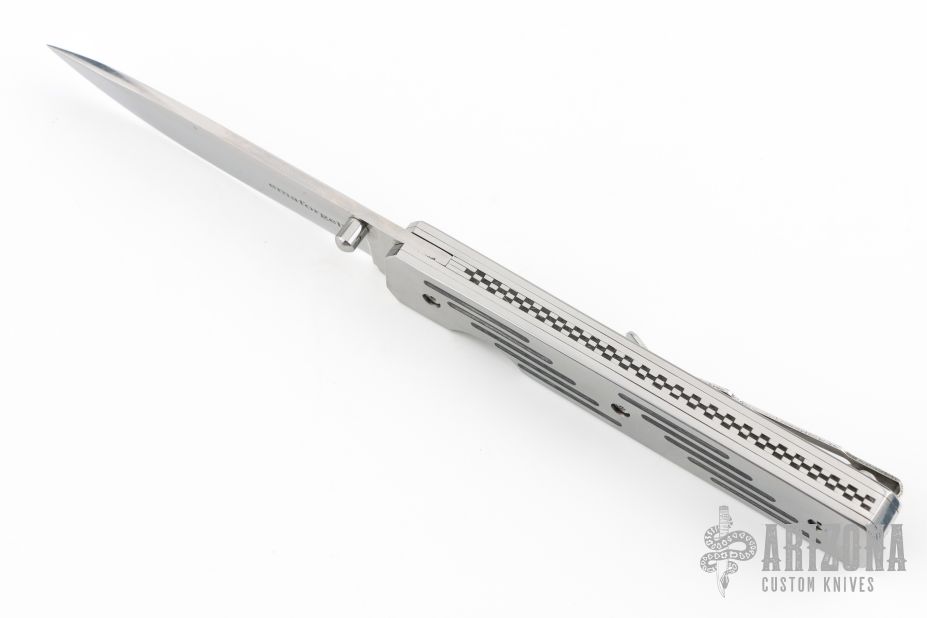 This linerlock by EMA Forge features a high satin finished blade with single thumbstud. The handle has stainless steel scales with black wood inlays, stainless steel liners and checkered backspacer, stainless steel tip up clip. Nice lockup. Comes with a brown leather sheath and original box. New from maker.