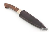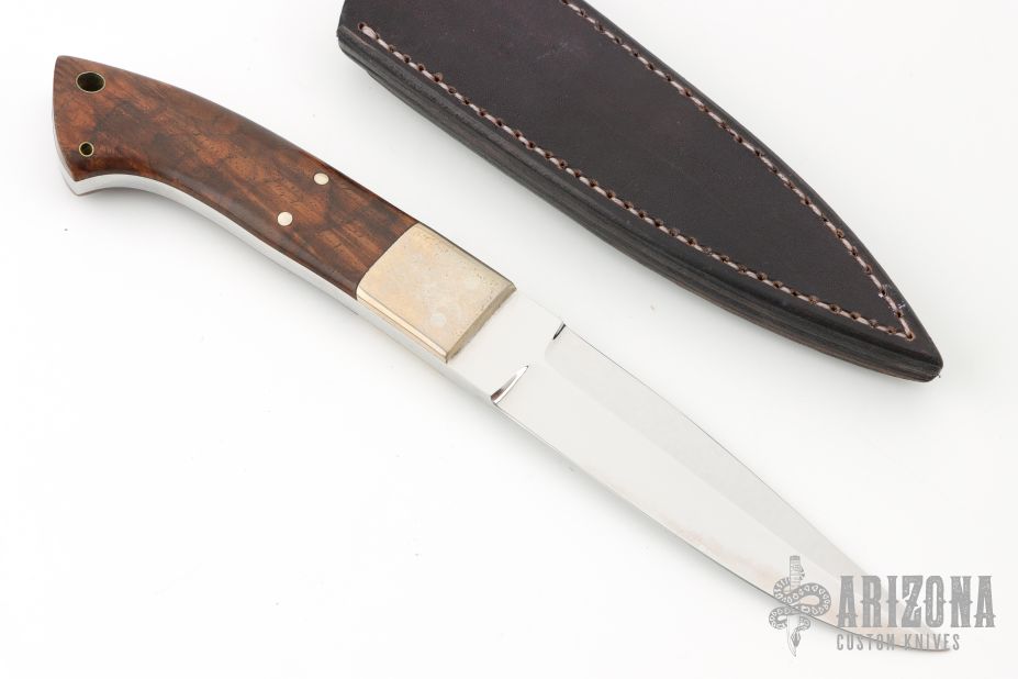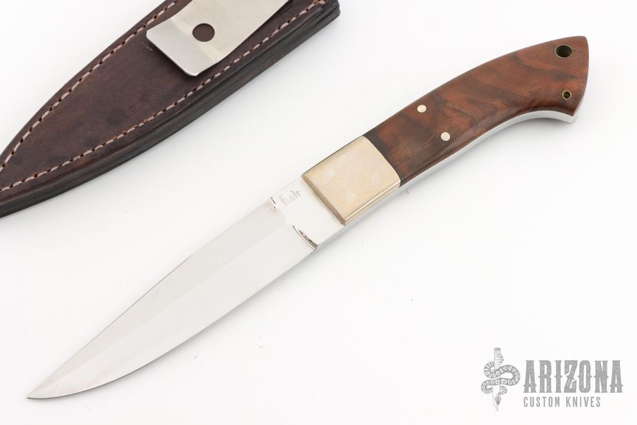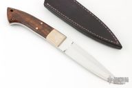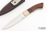 This boot knife by Lloyd Hale features a polished clip point blade with sharpened top edge, .183" blade stock and .977" blade depth, full tapered tang construction. The handle has dovetailed nickel silver bolsters and wood scales with nickel silver pins, lanyard holes at the butt. Comes with a zippered case. Comes with a black leather boot sheath, not original, but fits nicely. Excellent condition.