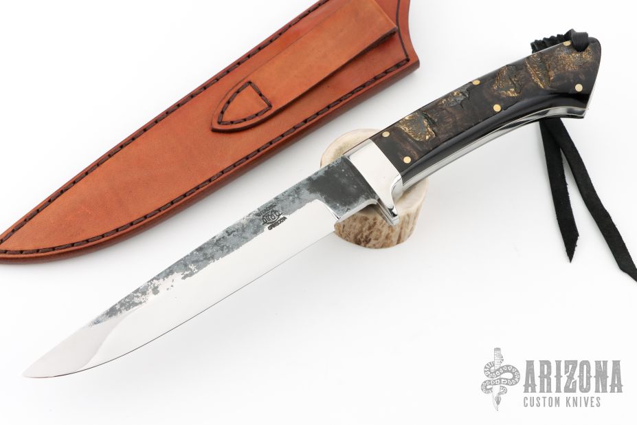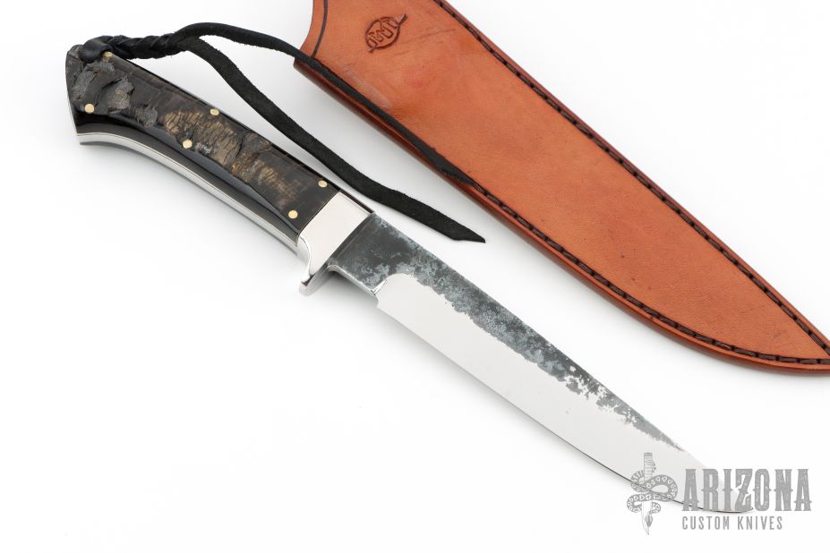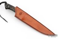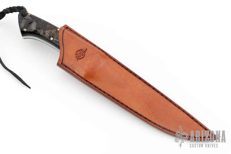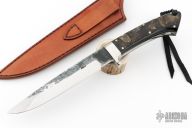 This Baltika from Citadel Knives features a mirror polished blade with forge finished flats, .162" blade depth and 1.080" blade depth, full tang construction. The handle is comprised of a stainless steel guard and cape buffalo horn scales over white liners, brass pins. Includes leather sheath with belt loop and a zippered case. Excellent condition.