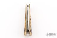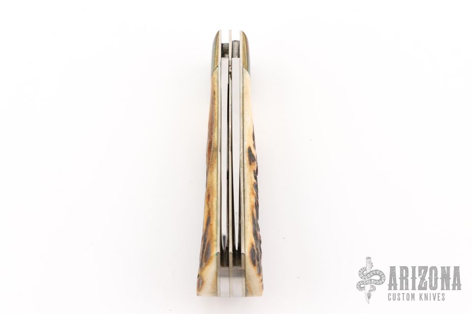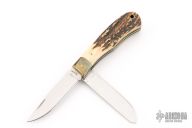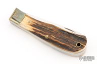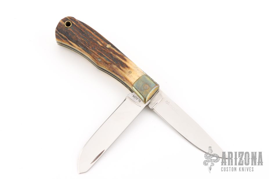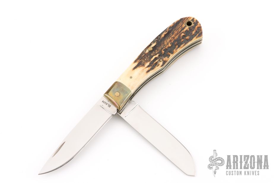 This Two-Blade Trapper by Roy Blaum features two mirror finished blades with nail nicks. The handle has brass dovetail bolsters, stainless steel springs, nickel silver liners, nice stag covers with brass pins and lanyard hole in pommel. Has half-stops. Has some scuffs and scratches, marked #002 on the blade. Great condition.