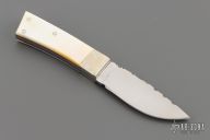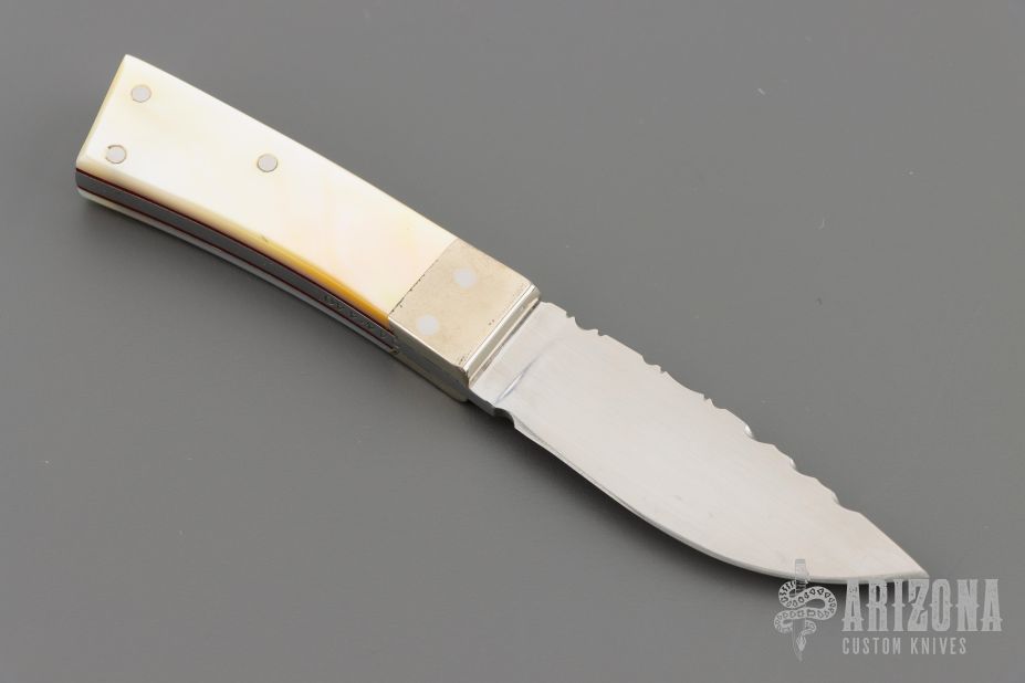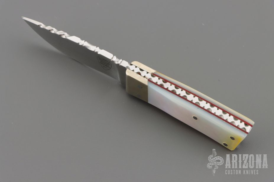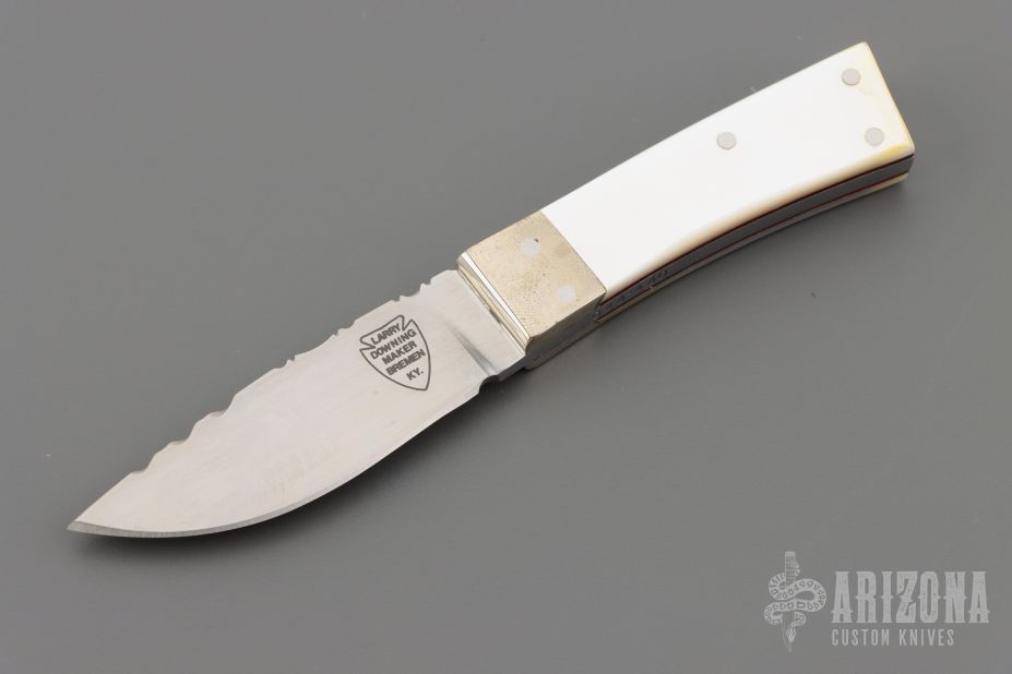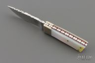 This knife by Larry Downing features a mirror finished blade with a file worked blade spine, .133" blade stock and .7" blade depth, full tang construction with nickel silver dovetail bolsters, gold lip covers, red liners and nickel silver pins. Has a couple light scratches, excellent condition.