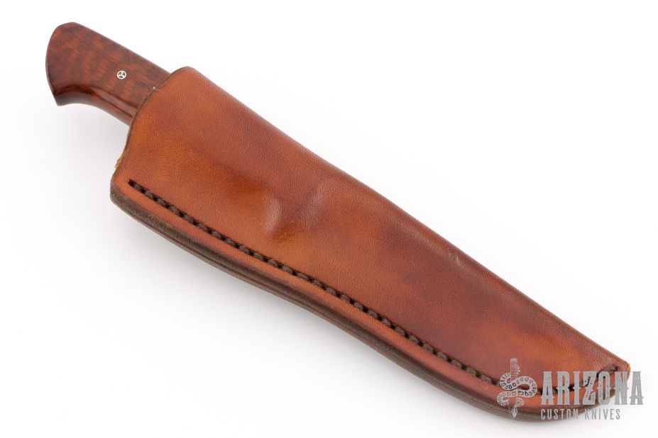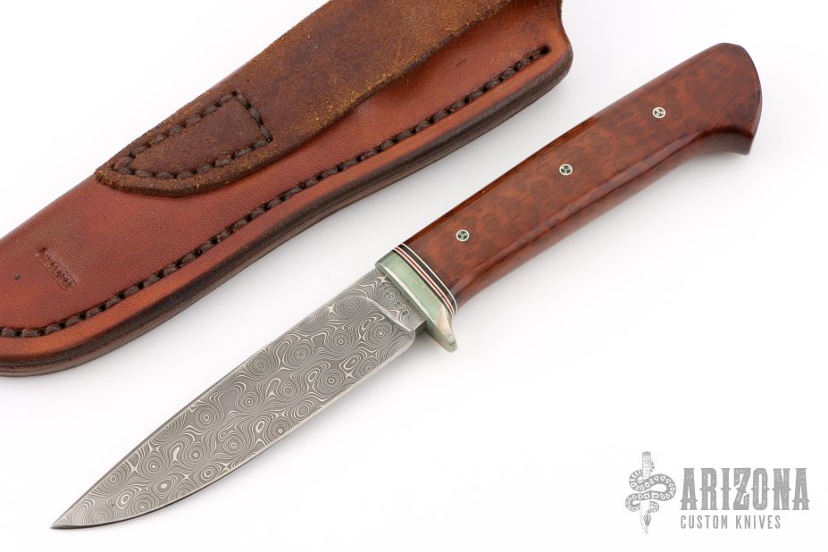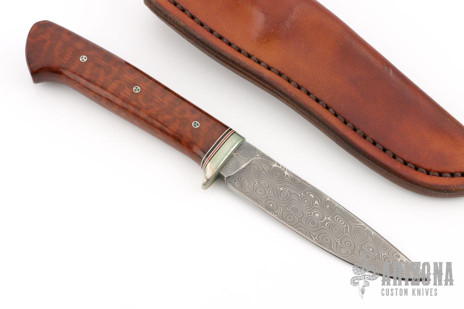 This Skinner by George Englebretson features a Damascus blade with .154" blade stock and .857" blade depth, hidden tang construction. The handle has a nickel silver guard, red/white spacers, wood grip, and mosaic pins. Thumb notches on the spine. Comes with a leather sheath. Has a couple light scratches and patina, otherwise excellent condition.