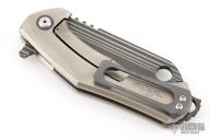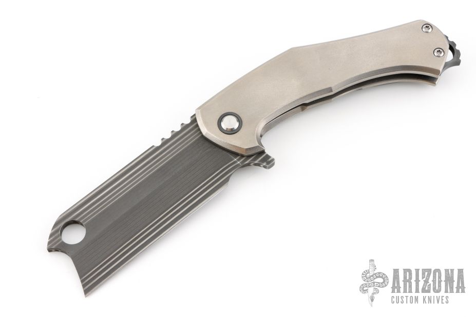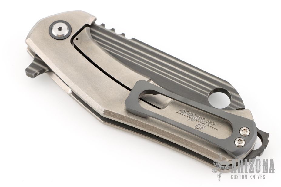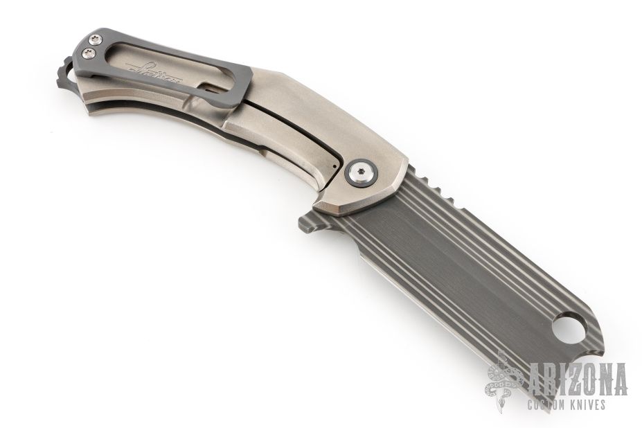 This Orphan by Eric Luther features a Damascus blade with milled fullers, hole in blade, notched thumbrest, and flipper. The handle has a bead blast finished titanium frame with Zirc pivot collars, matching backspacer with lanyard hole, and tip up clip. Comes with zipper case. Nice detent, lockup and blade seating. Excellent condition.