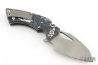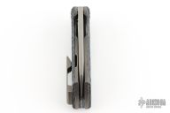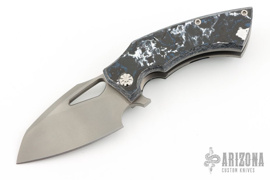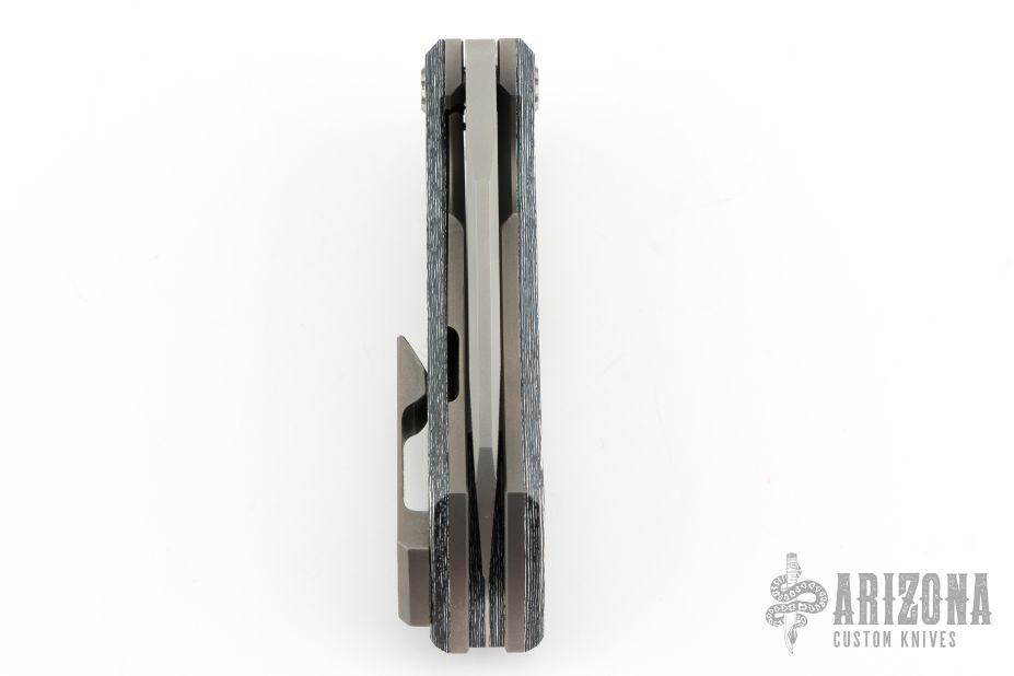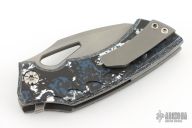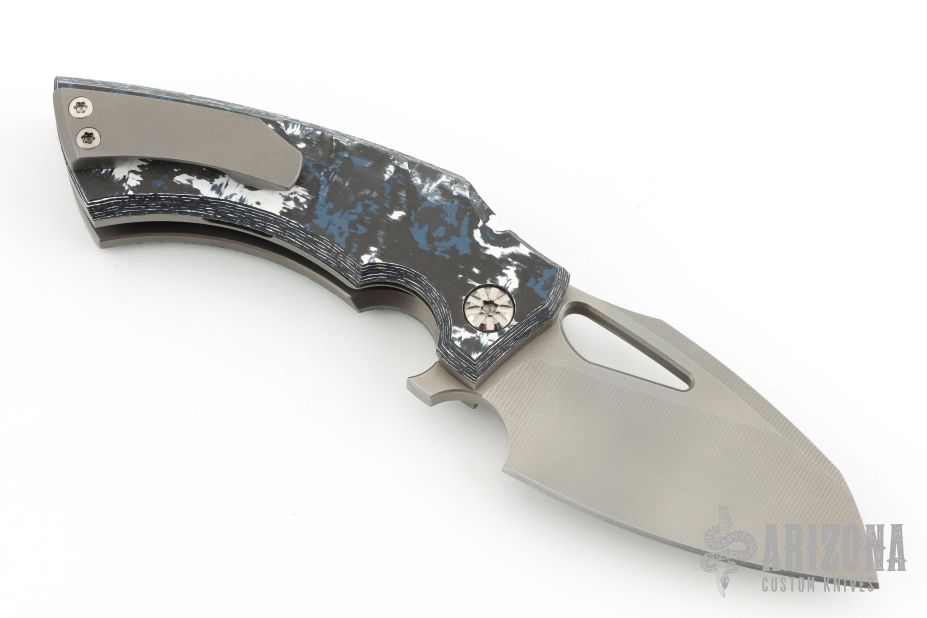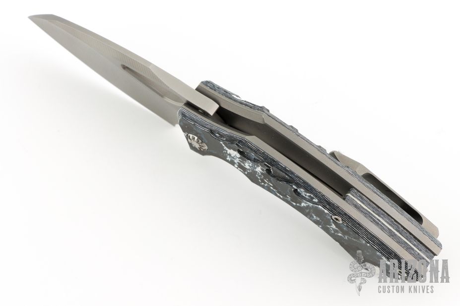 This Sancha M by Eric Luther features a bead blast finished milled drop point blade with thumb hole and flipper. The handle has a darkened and bead blast titanium frame with fat carbon covers, fat carbon backspacer, and matching titanium tip up clip. Comes with zipper case and COA dated 2.21.23. Nice detent, lockup and blade seating. Excellent condition.