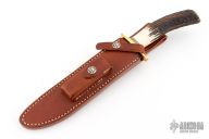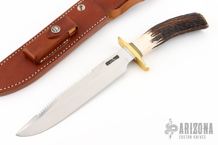 "The Model 1 was made famous by Allied combat troops in World War II and has since been widely used in all theaters of war." .221" blade stock and 1.320" blade depth, hidden tang construction. Has a satin finished blade with sawteeth on top edge. Brass guard and butt plate, stag grip handle with black/brass spacers. Includes a left handed brown leather sheath, origianl paper wrapping and a zipper case. Excellent condition.
