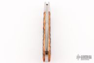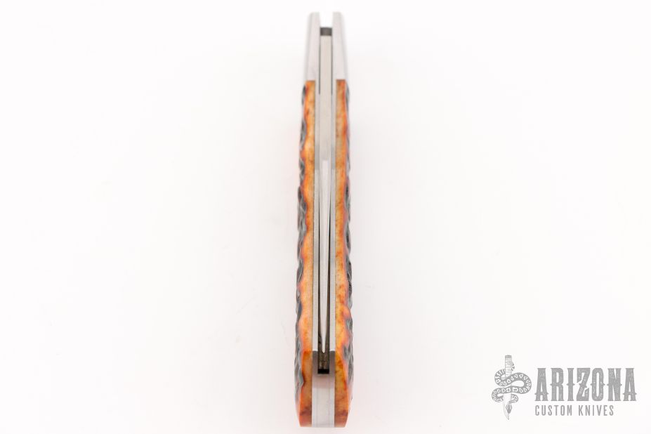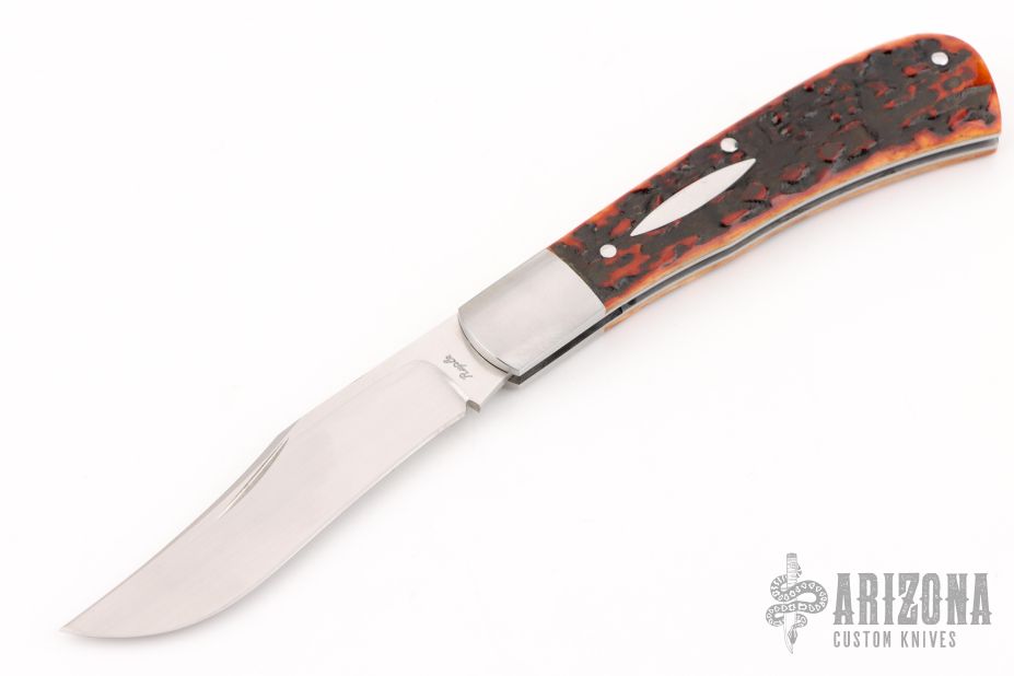 This Trapper by Bill Ruple features a hand rub satin finished blade with a single nail nick.  The handle has stainless steel bolsters, stainless steel liners and spring with stag jigged bone covers and a stainless steel escutcheon. Has half-stop, flush in all positions. Comes with a zippered case and COA. New from maker at the 2025 Blade Show.