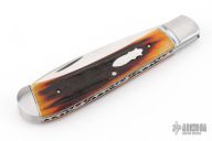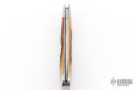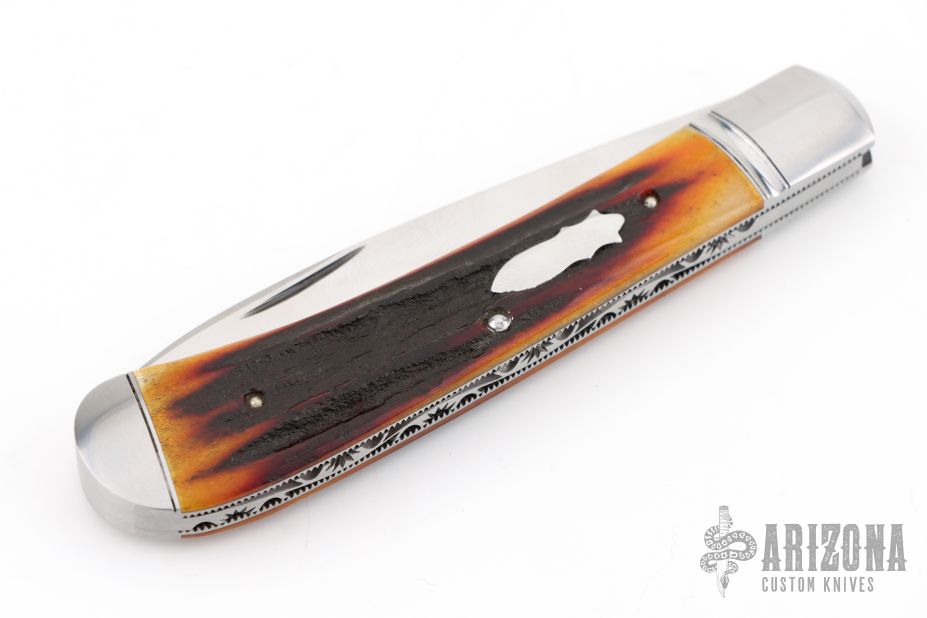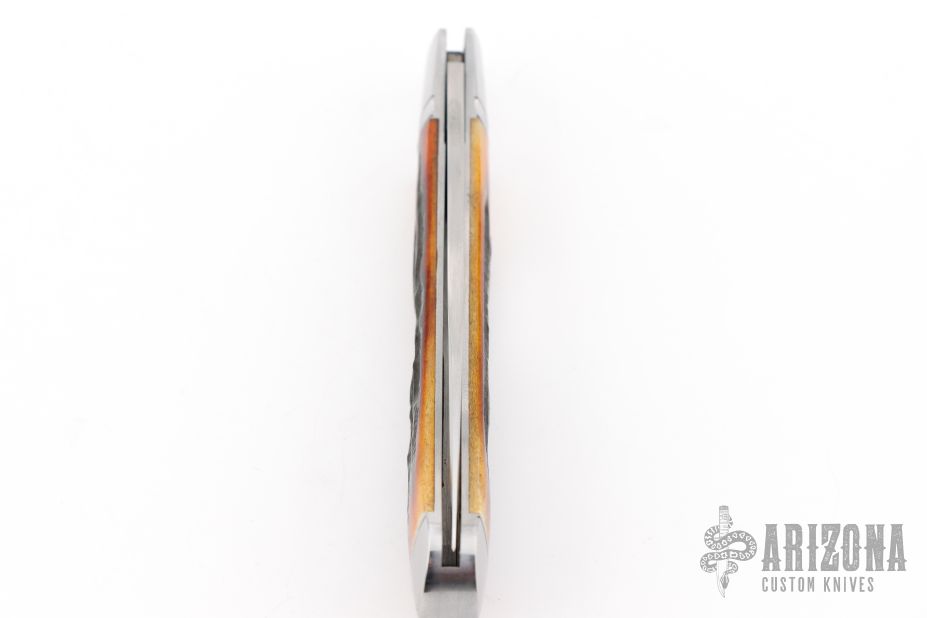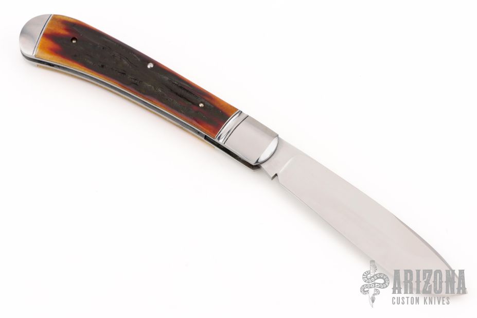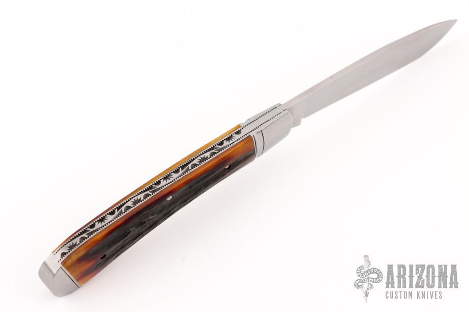 This slipjoint by Couch Knives features a satin finished blade with nail nick. The handle has threaded and fluted stainless steel bolsters with integral fileworked liners, amber stag covers with a stainless steel shield escutcheon, fileworked stainless CPM154 steel spring. Has half-stop, flush in all positions. Comes with a zippered case and COA. New from maker at the 2025 Blade Show.