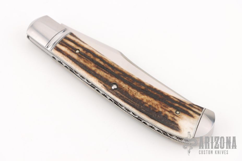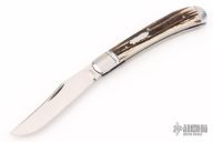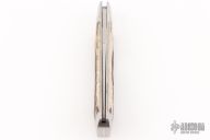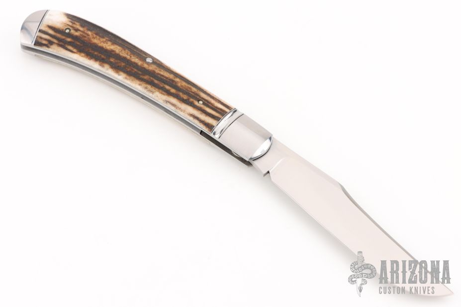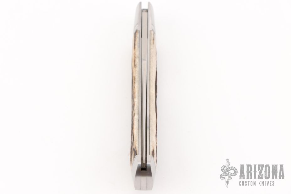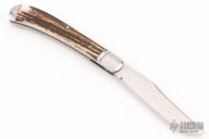 This slipjoint by Couch Knives features a satin finished blade with nail nick. The handle has threaded and fluted stainless steel bolsters with integral fileworked liners, Red Stag covers with a stainless steel shield escutcheon, fileworked stainless CPM154 steel spring. Has half-stop, flush in all positions. Comes with a zippered case and COA. New from maker at the 2025 Blade Show.