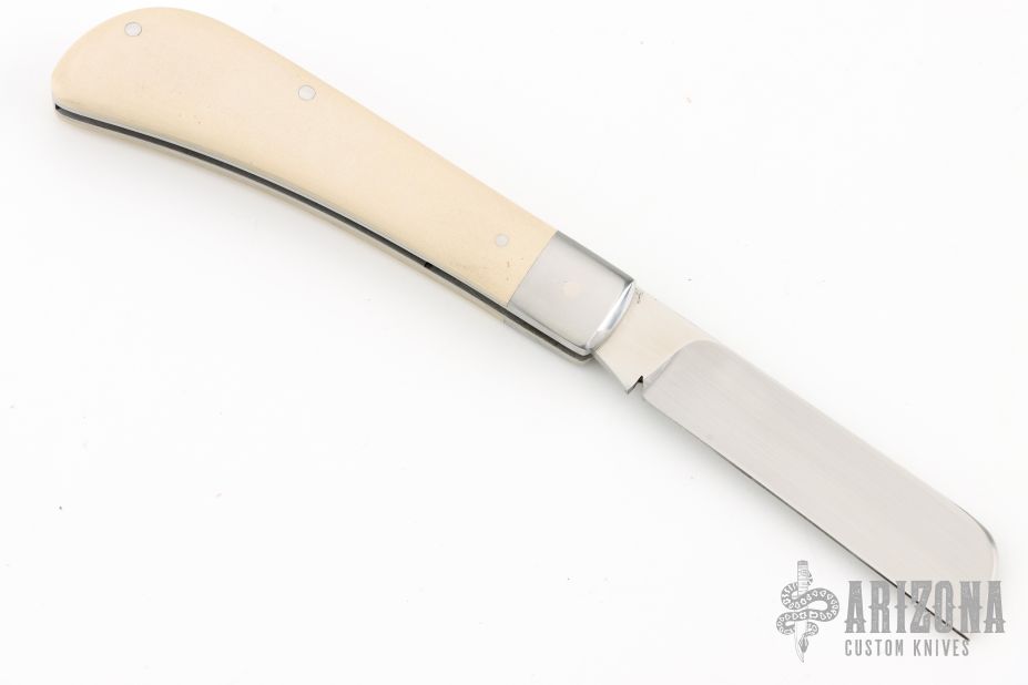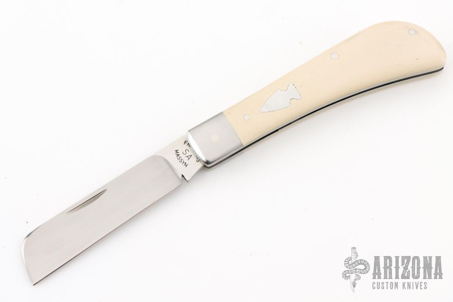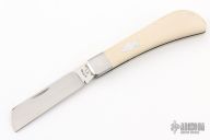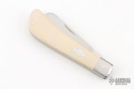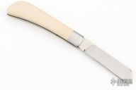 This slipjoint by Francois Massyn features a hand rub satin finished blade with nail nick. The handle has stainless steel bolsters and liners, ivory paper micarta covers with stainless steel escutcheon, stainless steel spring. Has half-stop, flush in all positions. Comes with a zippered case and makers card. New from maker at the 2025 Blade Show.