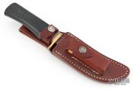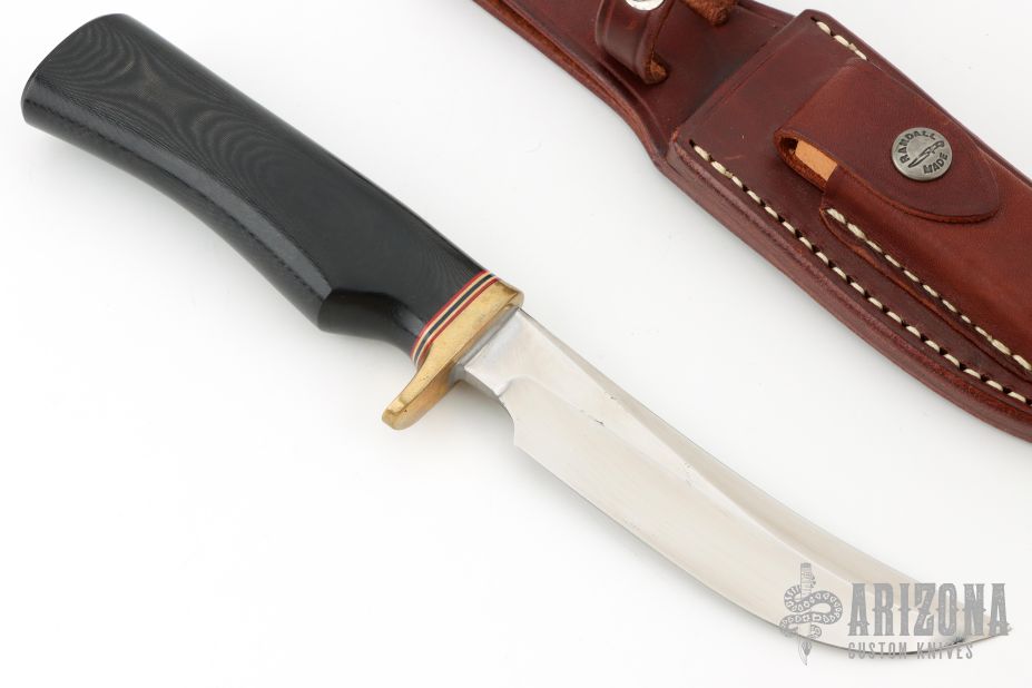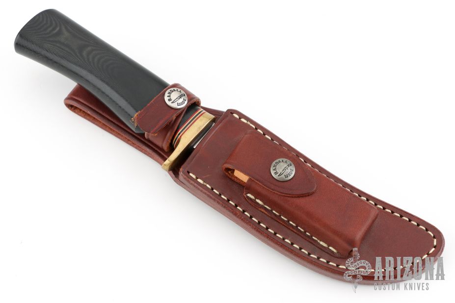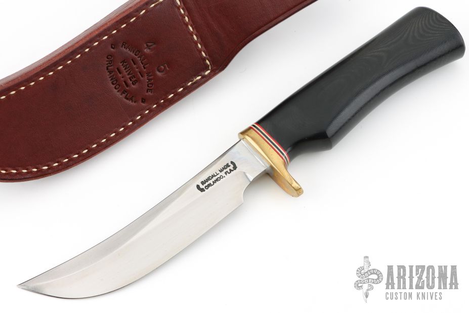 This Model 4-5 by Randall Made Knives features a satin finished blade with false top edge, .193" blade thickness and 1.024" blade depth, hidden tang construction. The handle has a brass guard, black linen micarta grip with red/white/blue spacers. Comes with a brown leather sheath. Excellent condition.