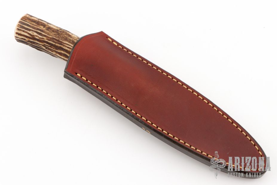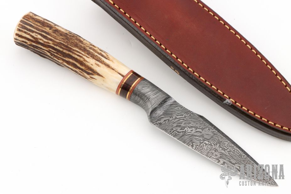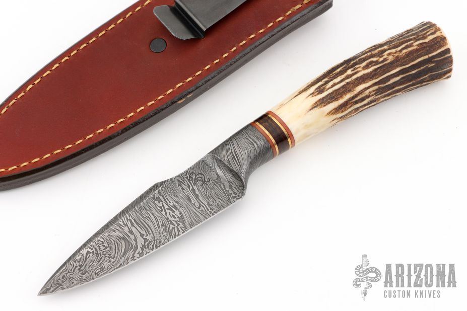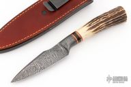 This Integral Hunter by Bob Rankin features a 1084/15n20 "Twisted Ws" Damascus blade with .132" blade stock and 1.094" blade depth, hidden tang construction. The handle features an integral Damascus guard, red/micarta/brass spacers, and a very nice stag grip. Great look and feel. Comes with a Treeman brown leather sheath. New from maker at the 2025 Blade Show!