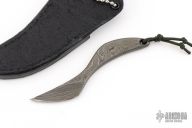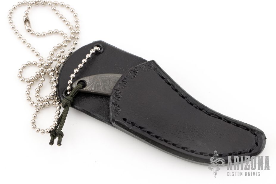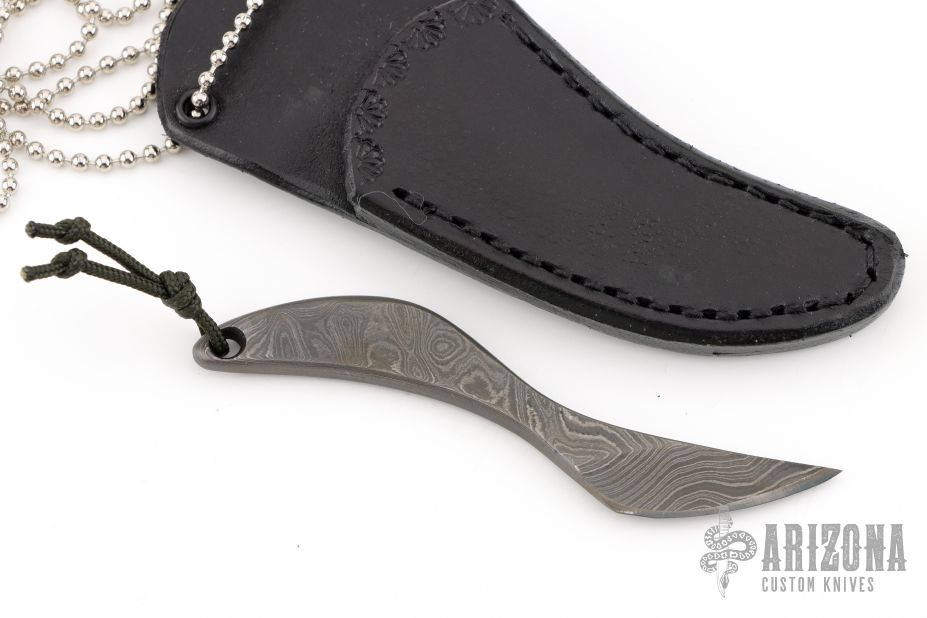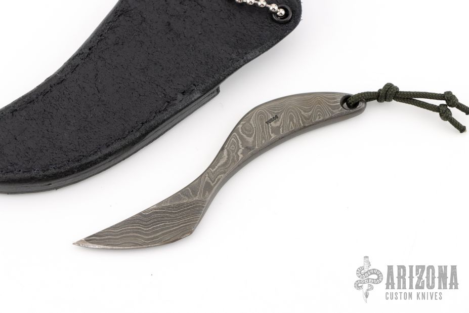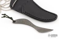 Damascus Neck knife by Mickey Yurco. Full tang construction, .196" bladestock, .561" blade depth, lanyard hole in pommel. Comes with a leather neck sheath with chain. New from maker at the 2025 blade show!