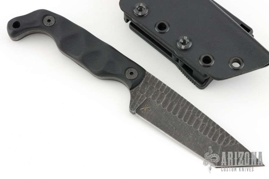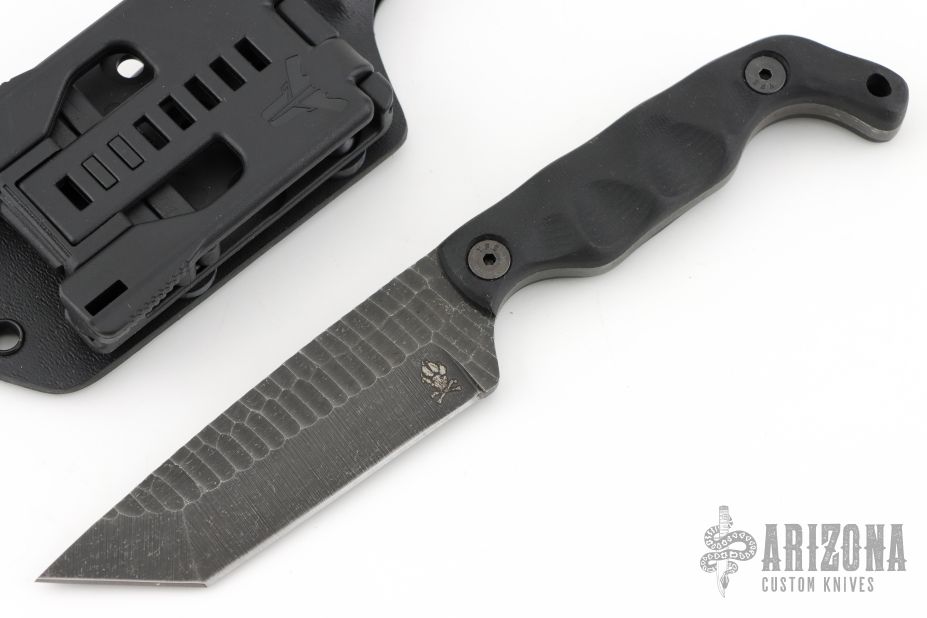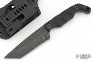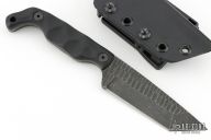 This B5T by Stroup Knives features a dark tumbled drop point blade with textured flats and a full tang construction.  .166" Blade Stock.  1.147" Blade Depth.  The handle features sculpted black G-10 scales.  Includes a kydex sheath with a Tek-Lok.  Includes the original box and papers. New from maker.