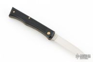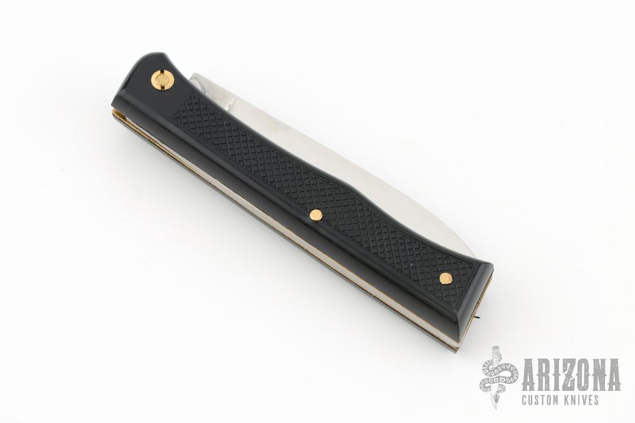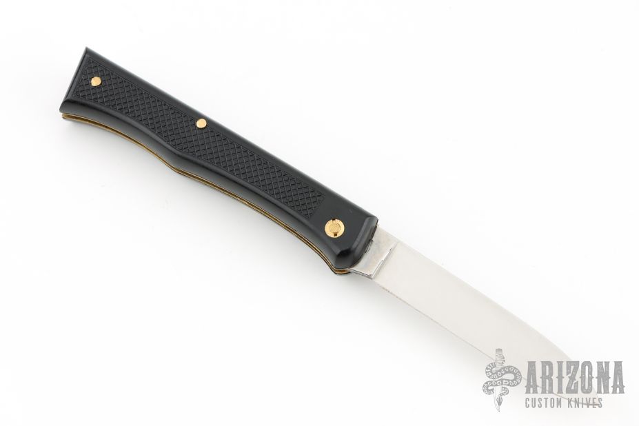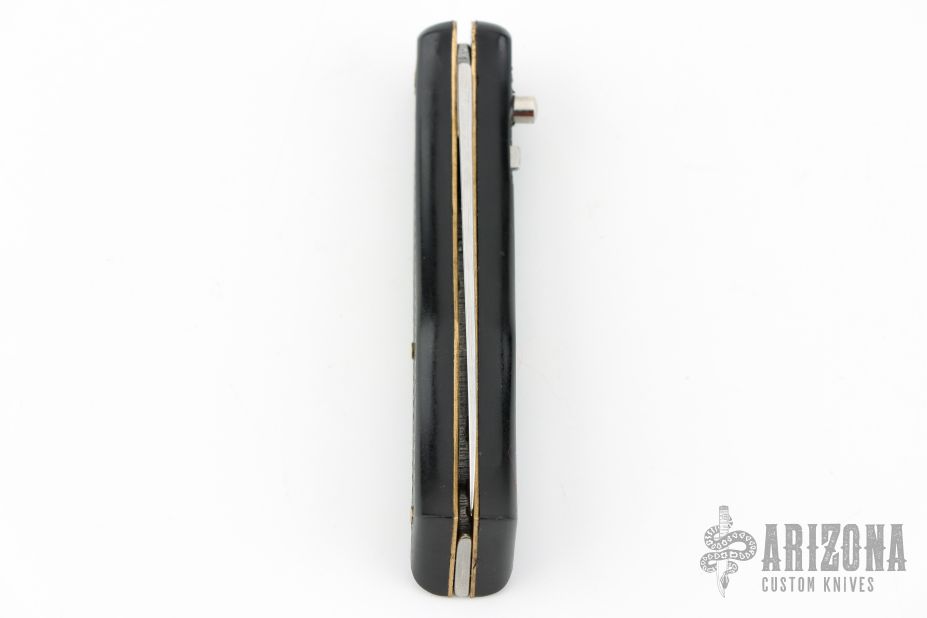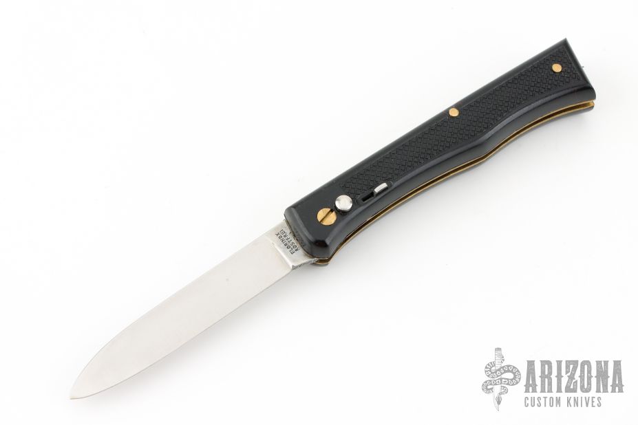 This Vintage Side Opening Auto by Florinox has a polished drop point blade. The handle is knurled plastic. Push the button to fire, safety below the button. Comes with a zipper case. Has some light scratches, excellent condition otherwise.