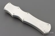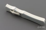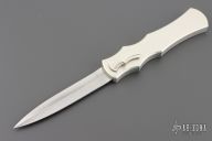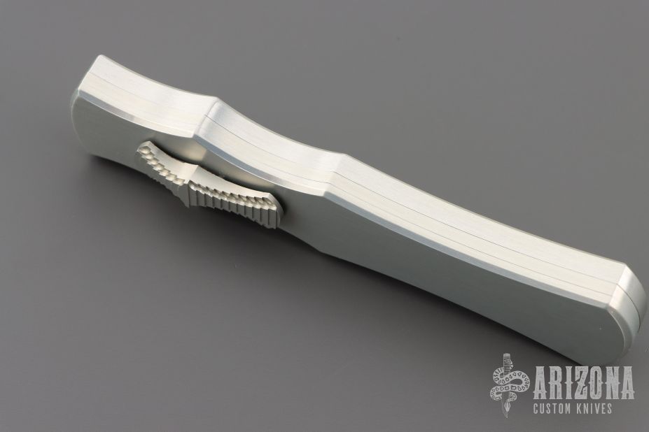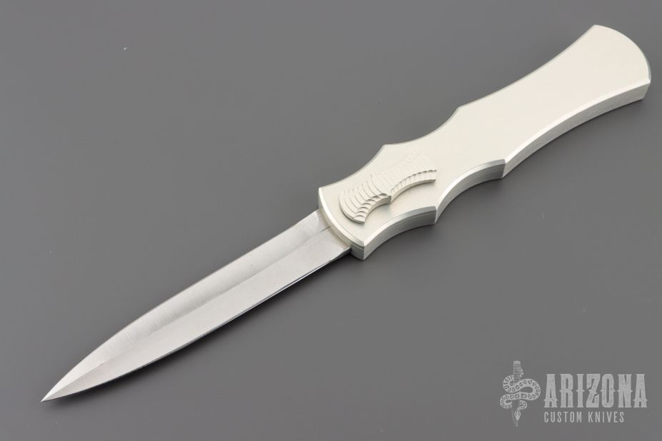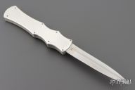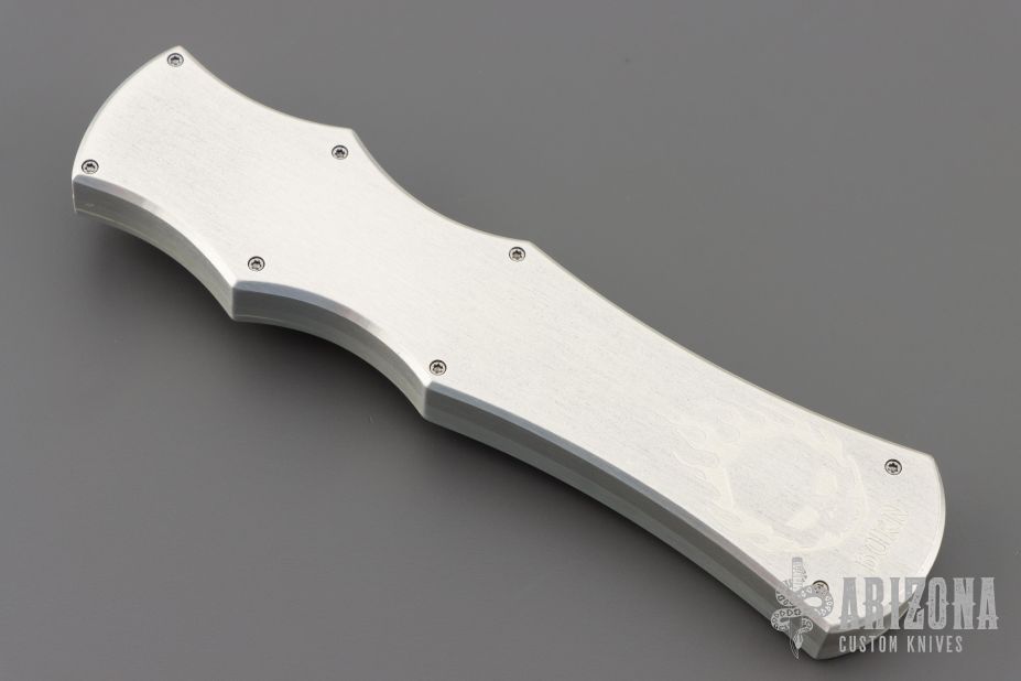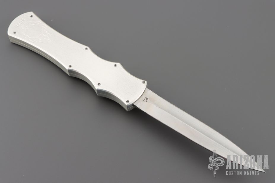 This Burn Custom Razor OTF has a satin finished hollow ground double edged blade. The chassis is cut from anodized aluminum with a matching thumbslide. Burn Logo is machined into the back side of the handle. Blade deploys with authority and locks up tight. This knife is marked "22" on the blade. Comes with maker's paperwork. Excellent condition.
