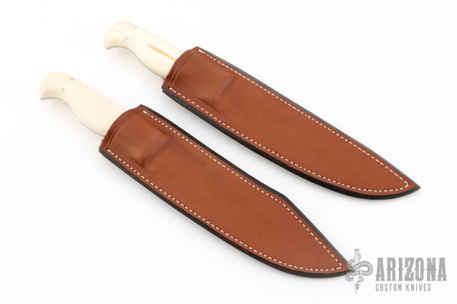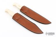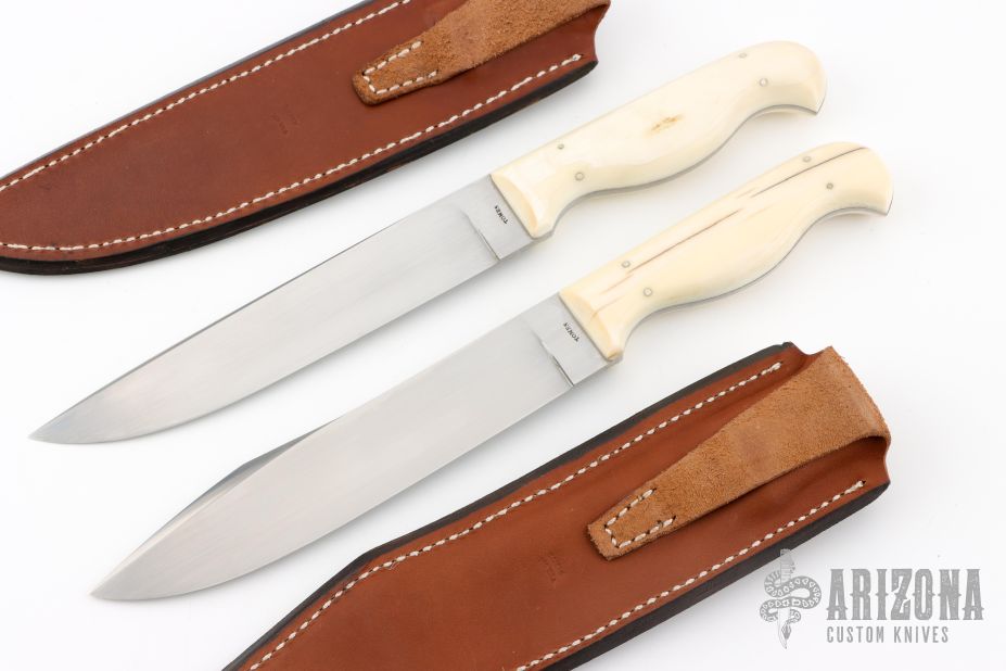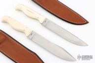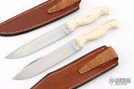 This pair of "Price Belt Knives" by PJ Tomes were made in homage to Michael Price's San Franscisco Belt Knives. The drop point has a hand rub satin finished blade with false top edge, .144" blade stock and 1.156" blade depth, full tapered tang construction. The handle has walrus ivory scales. Comes with a brown leather sheath. The harpoon style knife has a hand rub satin finished blade with false top edge, .142" blade stock and 1.306" blade depth, full tapered tang construction. The handle has walrus ivory scales. Comes with a brown leather sheath. Both come in a zippered case. New from maker at the 2025 Blade Show.