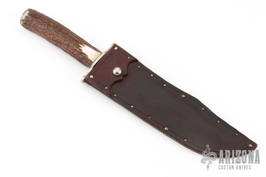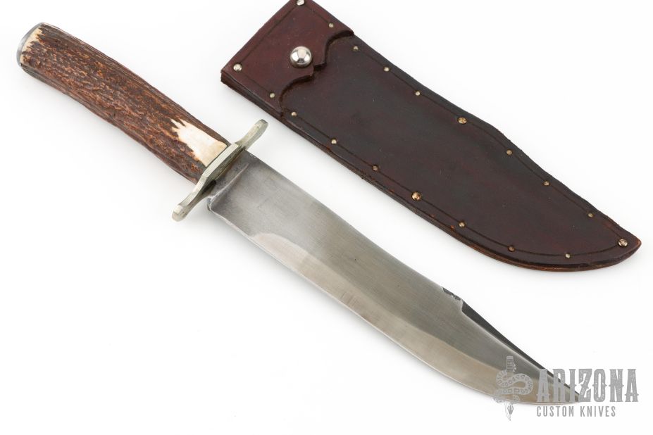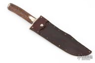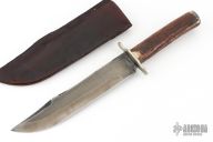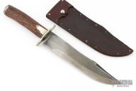 This Bowie by Willard Smith features a clip point blade with false top edge, .210" blade stock and 1.448" blade depth, hidden tang construction. The handle has a nickel silver guard, stag grip, pewter butt cap. Comes with a brown leather sheath. Has some light scratches and patina, otherwise excellent condition. Stamped WS on the ricasso.