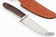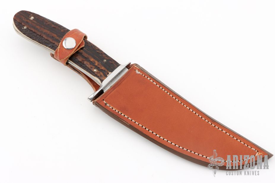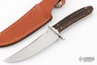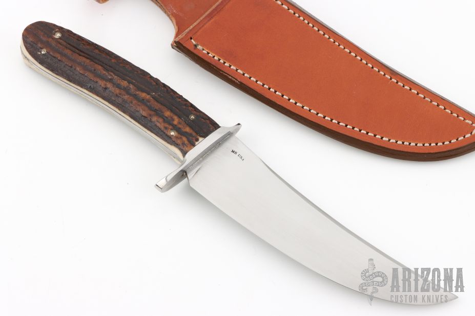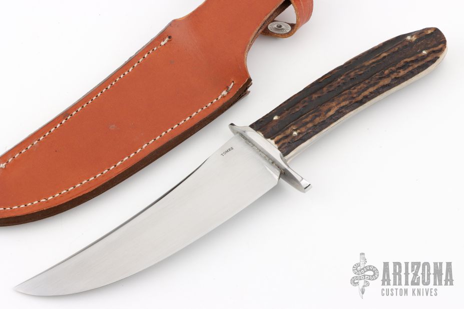 This Model 15 by Master Smith P.J. Tomes features a hand rub satin finished blade with .147" blade stock, 1.397" blade depth, full tapered tang construction. The handle has a stainless steel guard, stag scales and domed stainless steel pins. Comes with a brown leather sheath. New from maker at the 2025 Blade Show.