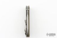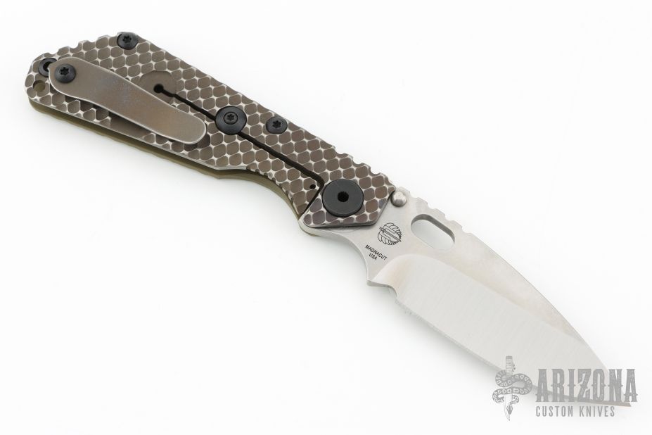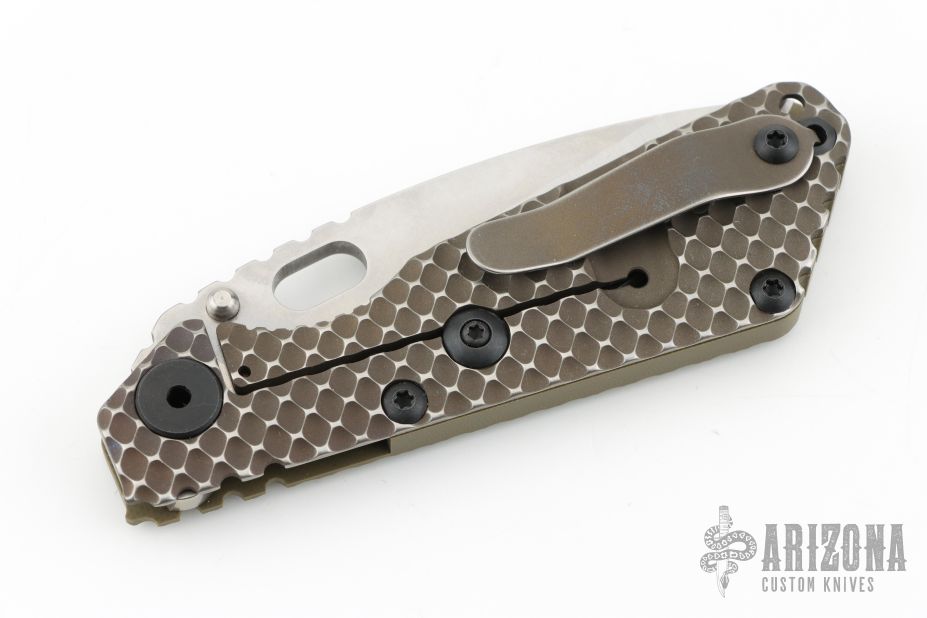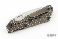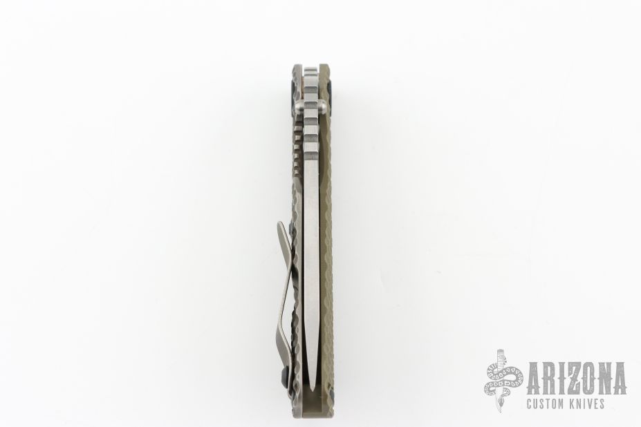 This SNG DGG by M Strider has a stonewashed blade with dual thumb studs, thumbhole, and notched thumbrest. Handle is green G-10 and bead blasted titanium "Gunner Grip", lockbar stabilizer, and titanium tip up clip. Nice detent, lockup and blade seating. Includes a SOE padded zippered case.  Excellent Condition.
